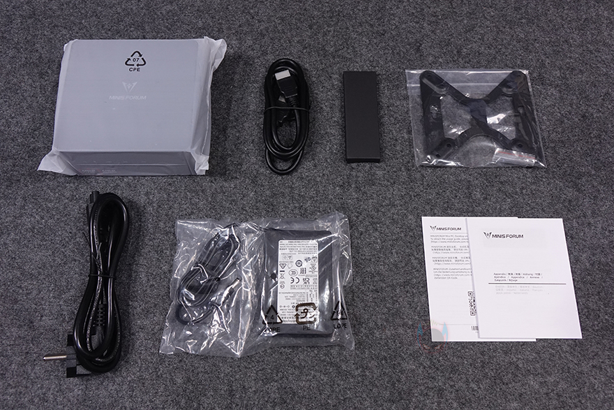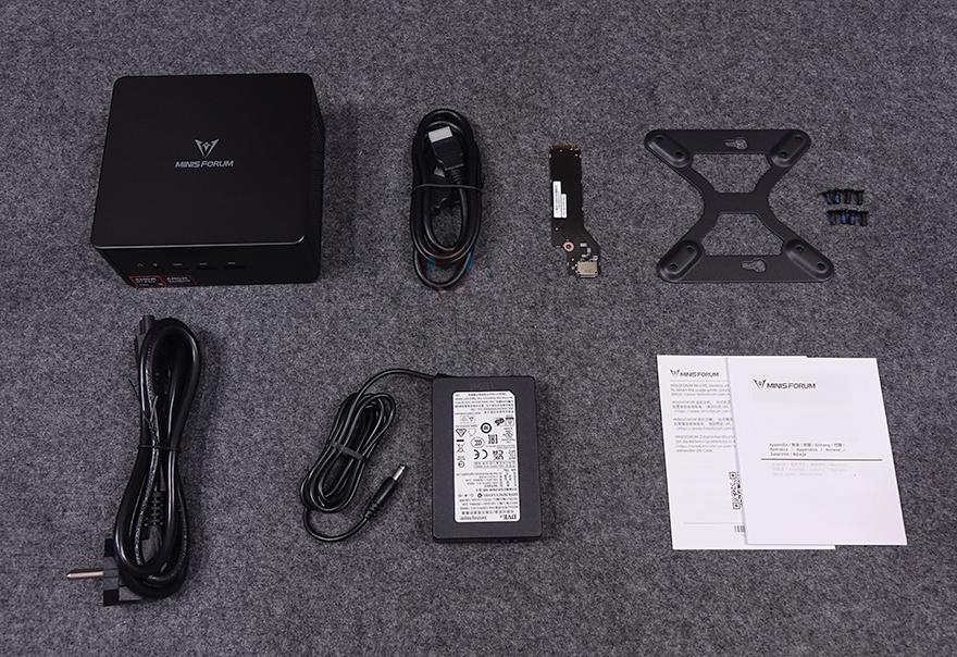 패키지 밴드를 슬라이드처럼 벗기면, 포장 박스를 확인할 수 있고, 박스를 열어보면, 외부 충격보호를 위해 우레탄-폼 포장재와 함께 비닐포장된 엘리트미니 UM890 PRO 미니 PC를 맨 먼저 확인할 수 있고, 아래 공간에 나머지 구성품들이 들어있는 걸 확인할 수 있습니다. 구성품 일부는 비닐 포장으로 처리되어 있으며, 유일하게 작은 박스 포장을 한 구성품이 있는데, 열어보면 M.2 슬롯을 통해 변환할 수 있는 OCulink 어댑터가 들어있죠. 전체 제품 구성은 엘리트미니 UM890 PRO 미니 PC, HDMI 케이블, M.2 to OCulink 어댑터, VESA 마운트 및 나사, 전원 케이블 및 어댑터, 설명서 제공으로 이루어져 있습니다.
