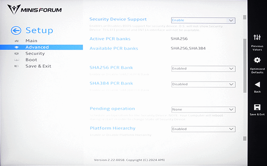 운영체제까지 기본 설정이 끝나면, 성능을 확인해 보기 전에 엘리트미니 UM890 PRO 미니 PC의 바이오스(BIOS) CMOS 화면을 잠깐 살펴보는데, Delete 키를 눌러 CMOS로 진입하면, AMI 바이오스지만, UEFI처럼 미니스포럼 자체의 커스텀 UI 디자인을 적용하고 있습니다. 일반 미니 PC에서 보는 구형 AMI 디자인이 아니기 때문에 좀 더 보기에 편하고, Setup 메뉴로 들어가면 CMOS 화면에서 흔히 보는 메인(Main), 고급(Advanced), 보안(Security), 부트(Boot), 저장&종료(Save&Exit) 메뉴를 확인할 수 있습니다. 특히, 고급(Advnaced) 메뉴로 들어가면, 시스템 관련 메뉴들을 확인할 수 있는데, TPM, CPU, 온보드(Onboard) 관련 메뉴들뿐만 아니라 AMD CPU 탑재 시 볼 수 있는 CBS와 PBS 메뉴도 갖추고 있어서 전력제한 설정도 가능하죠. 물론, 자동 부팅 기능의 Wake on LAN, Wake on RTC 항목도 갖추고 있습니다.