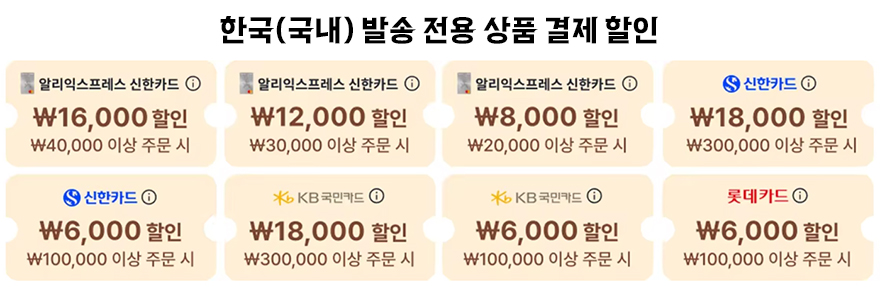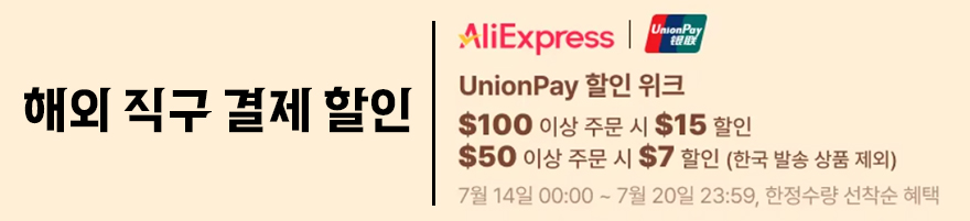 먼저 이번 7월 프로모션 결제할인은 해외 직구용과 한국 발송 즉 국내 발송 결제할인 2가지로 나뉜다. 해외직구 구매시 결제할인은 유니온페이 카드사만 적용되며, 100달러이상 구매시 15달러 할인, 50달러이상 구매시 7달러 할인을 받을 수 있다. 국내에서 발송되는 한국발송 상품 구매시에는 알리익스프레스 신한카드와 일반 신한카드, KB카드, 롯데카드 사용시 할인 받을 수 있다. 즉, 이번 행사에서는 국내상품 구매시 좀 더 할인혜택이 좋다. 물론, 할인코드는 국내외 모두 적용되며, 할인코드 정보는 아래와 같다.