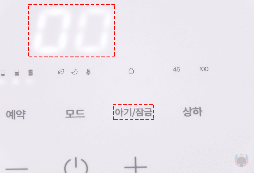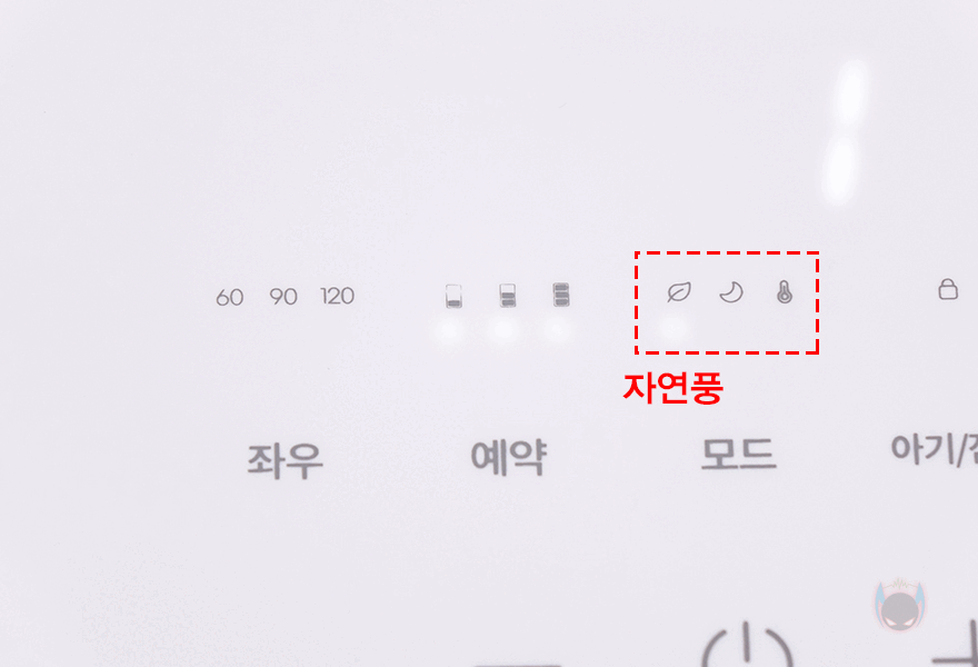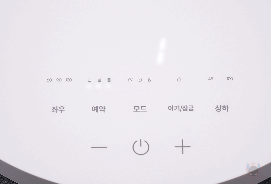 좀 더 자세히 조작 버튼의 기능들을 살펴보면, 맨 왼쪽에 위치한 좌우 회전은 OFF→60˚→90˚→120˚ 순으로 회전 범위를 설정할 수 있습니다. 그리고, 모드 같은 경우에는 자연풍 →수면→온도 3가지 모드를 지원하는데, 자연풍 모드는 사용자가 풍량 단계를 설정하면 1단계와 번갈아가면서 작동하고, 수면모드는 풍량 설정 후 30분 간격으로 1단계씩 낮아집니다. 그리고, 마지막 온도모드는 주변 온도에 따라 자동으로 풍량조절이 되는데, 22˚까지는 1단계로 작동하고 33˚이상부터는 최고 12단계로 작동합니다. 사용하는 환경에 따라서 온도모드가 은근히 유용합니다. 그리고, 아기가 조작 버튼을 만져도 작동하지 않게 차일락 기능도 있으며, 마지막 상하 회전은 45˚와 100˚ 범위 중 선택할 수 있고, 맨 아래 각도는 -10˚정도입니다.