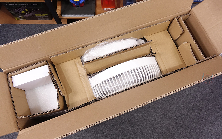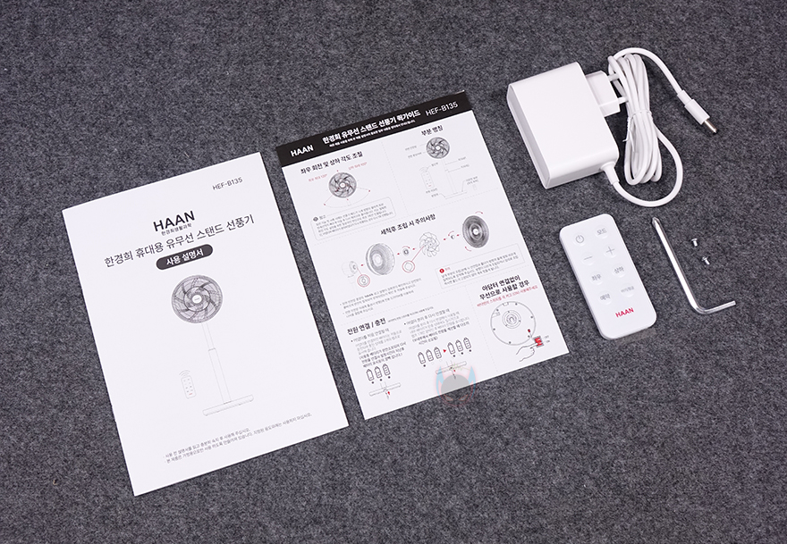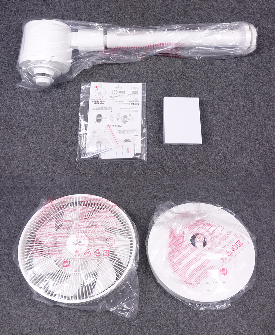 박스를 열어보면, 부위별로 분해되어 포장된 상태를 확인할 수 있고, 전원어댑터를 제외하고는 모두 비닐 포장으로 되어 있습니다. 일단, 조립 전에 구성품을 확인해보면, 모터가 달린 스탠드, 날개와 그릴, 받침대, 제품설명서 및 퀵가이드, 전원어댑터, 나사 및 드라이버 공구로 이루어져 있습니다.