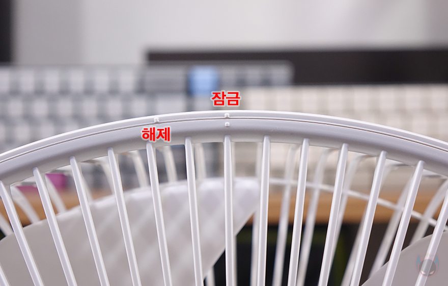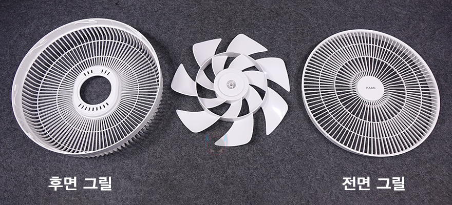 자, 다시 날개와 그릴 장착 이야기로 돌아와서, 날개와 그릴이 포장된 비닐들 벗기면 앞뒤 그릴과 날개로 나뉘어진 것을 확인할 수 있습니다. 먼저 후면 그릴부터 모터 부분에 장착하는데, 모터에 장착된 그릴 고정 홀더와 날개 고정 홀더를 분리한 후, 후면 그릴을 장착합니다. 후면 그릴 뒷부분에 홈 방향을 보면 쉽게 장착 방향을 알 수 있고, 그릴 장착 후 그릴 고정 홀더를 고정해 줍니다. 그다음으로 날개를 장착해 주고, 역시 날개 고정 홀더로 고정해 준 다음 마지막으로 전면 그릴을 장착합니다. 선풍기 청소를 위해 분해해 본 사람이라면 동일한 장착 방식이라 어렵지 않게 조립할 수 있습니다. 물론, 전면 그릴 맨 윗부분 중앙에 그릴 잠금/해제 표시도 되어 있으며, 시계 반대 방향으로 돌리면 해제, 시계 방향으로 돌리면 잠금이고, 그릴 맨 아랫부분에는 일반 선풍기처럼 나사로 고정해 줍니다. 물론, 앞서 구성품에서 확인한 제공되는 나사와 드라이버 공구를 사용하면 되죠. 이렇게 하면 선풍기 조립이 마무리됩니다.