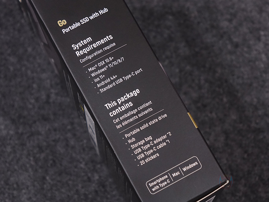 제품 패키지부터 살펴보면, 제품박스 전면에는 브랜드명과 함께 제품 이미지, USB 3.2 Gen2 규격, 최대 읽기/속도, 용량 표기 등을 확인할 수 있는데, 제품 이미지를 보면 2개의 장치가 결합되는 이미지로 바로 박스 측면에 추가 정보를 통해 용도를 쉽게 알 수 있습니다. 하나는 허브 장치이며, 나머지 하나는 SSD죠. 뒤에서 다시 확인하겠지만, 허브와 SSD에 적용된 연결 인터페이스는 모두 USB 타입 C 규격입니다. 그리고, 반대편 측면에는 운영체제 지원과 구성품 목록을 표기하고 있는데, 모바일 콘셉트를 가진 제품이지만, SSD 제품이기때문에 대부분의 PC와 모바일 운영체제에서 호환이 됩니다. 또한, 박스 후면에는 연출 이미지와 함께 시작에서 언급했듯이 국내에서도 펀딩으로 먼저 정식 판매가 되고 있기 때문에 KC인증까지 받은 제품이며, 국내 수입사를 통해 A/S를 받을 수 있는 정품스티커도 제공을 해줍니다.