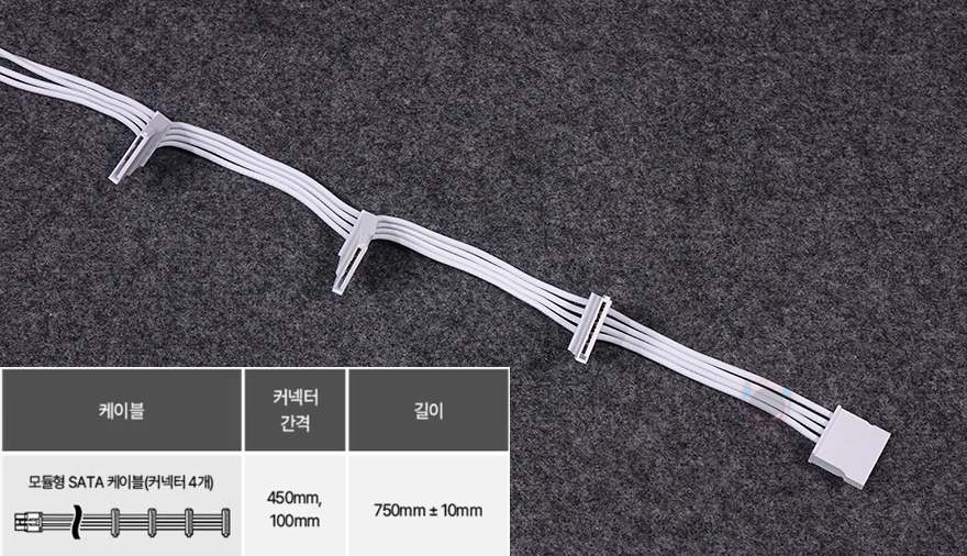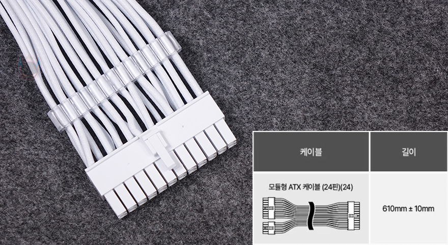 본체와 연결되는 모듈러 케이블은 총 9개 구성으로 먼저 출시해서 만난 850W 용량의 RM850e ATX 3.1 구성 케이블보다 1개 더 많습니다. 케이블 형태는 현재 가장 유연하고 슬림하기로 평가받는 메쉬 패턴 슬리빙 케이블을 적용했으며, 케이블 정리와 유지에 도움이 되는 클립도 메인보드와 그래픽카드 보조전원 케이블 위주로 적용되어 있는데, 화이트 색상에 맞춰 투명 클립으로 적용했습니다. 기본 메인보드 24핀 전원커넥터를 비롯한 커넥터 구성에는 ATX 보조전원 8(4+4) 핀 2개, 12V-2x6 PCIe 16핀 1개, PCIe 16핀 12V-2x6 → PCIe 8핀으로 변환되는 커넥터 2개, PCIe 8(6+2) 핀 2개, S-ATA 커넥터 6개, P-ATA 커넥터 2개를 구성하고 있습니다. 방금 언급했던 바로 아래 모델 RM850e ATX 3.1보다 PCIe 8핀 케이블이 1개 더 많은 거죠. 그래서, 웬만한 하이엔드 그래픽카드는 대부분 원활하게 연결할 수 있습니다.