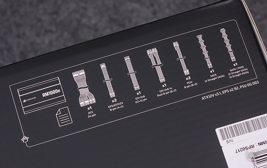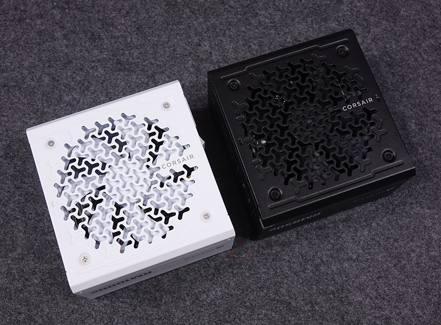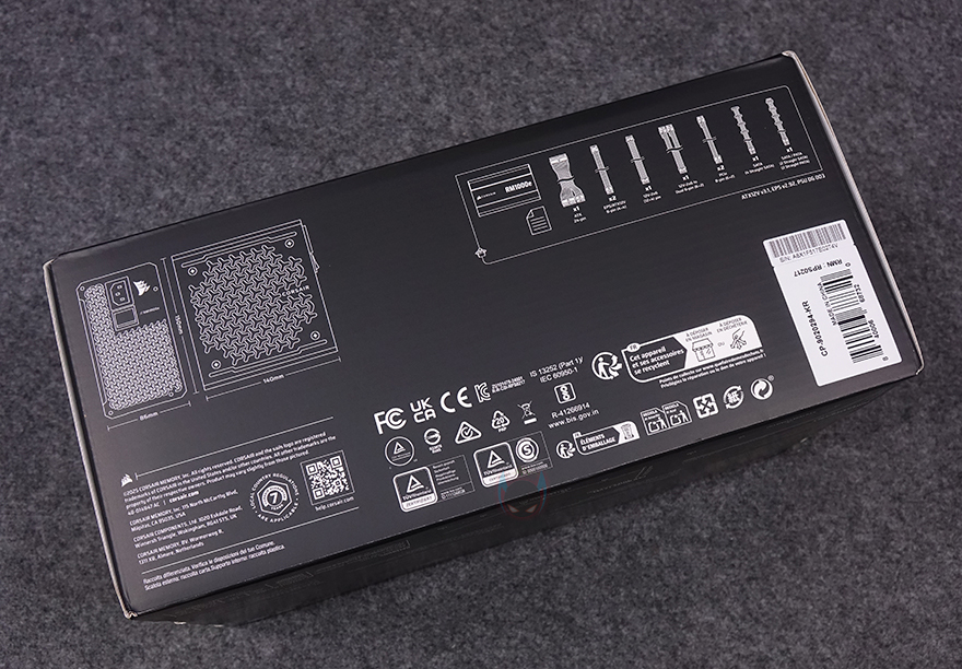 본체 상단에는 커세어 자사 제품에서 많이 볼 수 있는 특유의 Y자형 패턴 디자인 에어홀 처리와 함께 내부에도 화이트 색상의 120mm 팬이 장착된걸 외부에서 간접적으로 확인할 수 있습니다. 그리고, 패턴 디자인 한쪽에는 CORSAIR 문구도 새겨놨죠. 후면 배기 디자인 역시 Y자형 에어홀을 적용해 놨으며, 경쟁사 제품들과 달리 전원 스위치를 큼지막하게 적용해 PC케이스 후면에 배치되더라도 쉽게 스위치 구분이 될 수 있게 했습니다. 반대편인 전면에는 모듈러 케이블과 연결되는 커넥터들이 배치되어 풀-모듈러 방식을 지원하고 있으며, 메인보드, PCIe, SATA/PATA, 12V-2x6 크게 4 분류로 커넥터를 배치해 놨습니다. 양쪽 측면에는 각각 모델명과 박스에서 확인했던 제품의 기본 사양 표기를 다시 확인할 수 있죠.