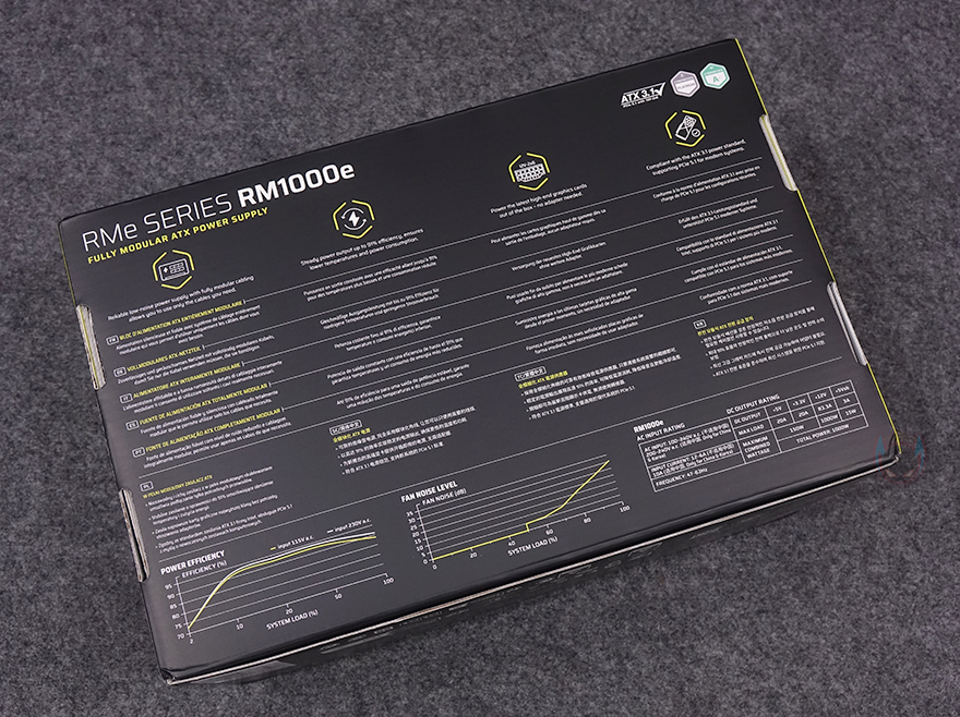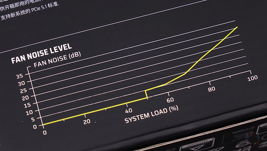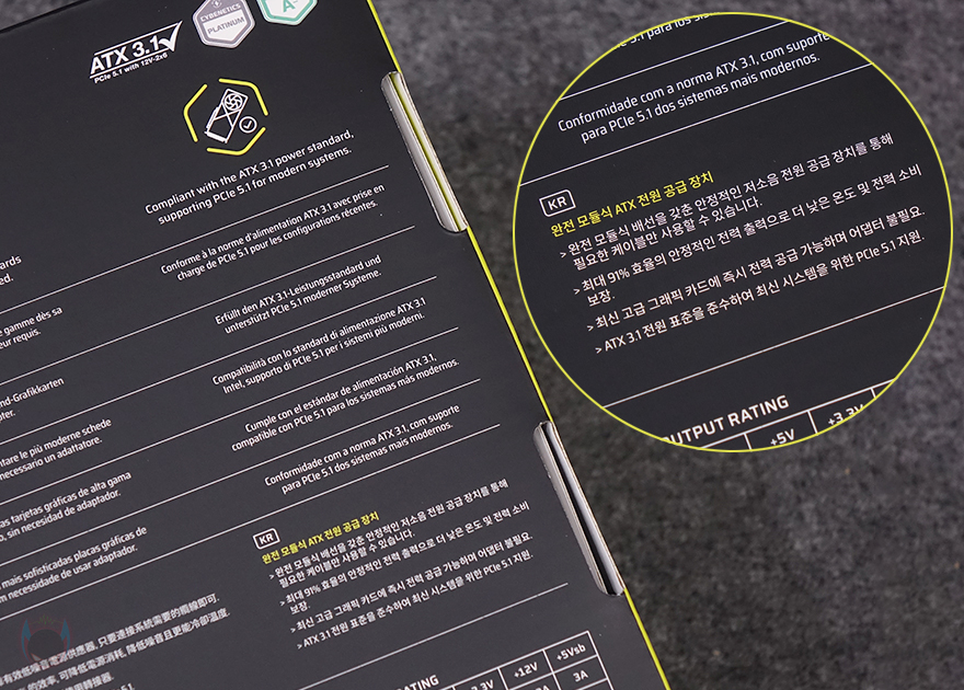 박스 측면에는 주요 특징으로 풀-모듈러, 방금 언급했던 사이버네틱스 플래티넘 전력효율등급, Nvidia 최신 하이엔드 그래픽카드에 사용되는 12V-2x6 16핀 보조전원 지원을 언급해 놨으며, 박스 후면에는 동일한 특징 언급 외에 추가로 ATX 3.1 규격과 PCIe 5.1 지원으로 언급하고 있는데, 아래에 한국어를 포함 다국적 언어로 표기해 놨습니다. 그리고, 추가로 전력효율 그래프와 팬 소음 그래프, 해당 제품의 기본 사양 표기를 확인할 수 있는데, 팬 소음 그래프를 보면 일정 Load 상황까지는 0dB로 제로팬 기술이 적용되었다라는 걸 알 수 있습니다. 그리고, 박스 개봉 부분에는 제품의 사이즈와 모듈러 케이블 구성을 표기해 놨는데, 시작에서 언급했던 140mm 깊이 사이즈를 확인할 수 있죠.