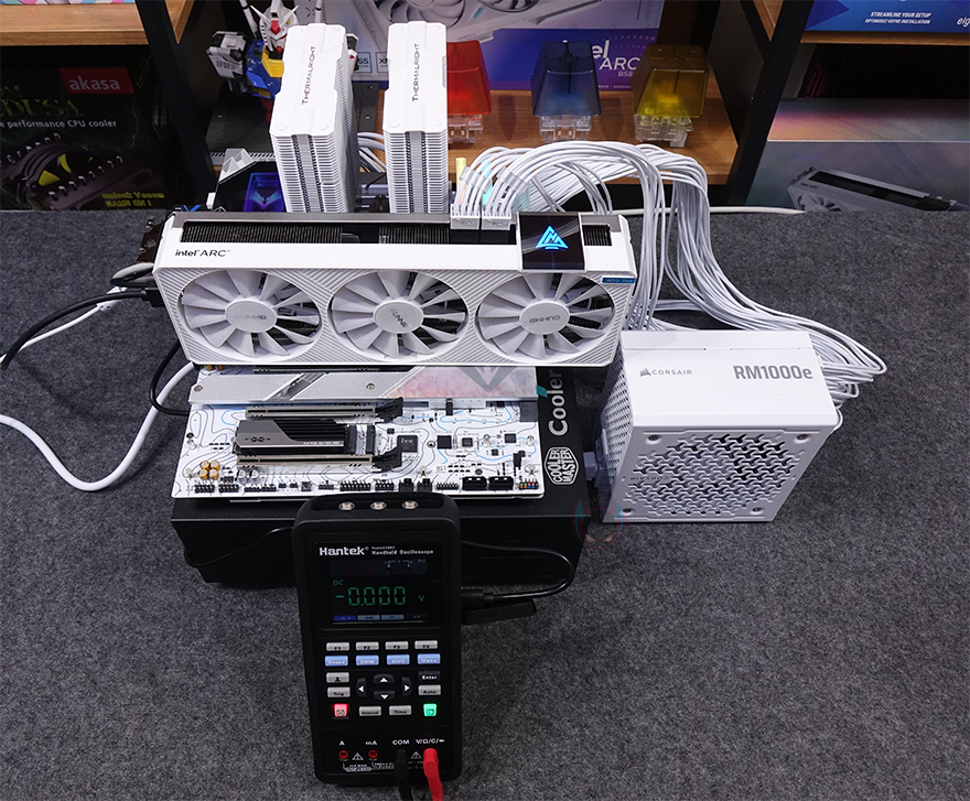 그럼, 직접 시스템을 갖춰서 커세어(CORSAIR) RM1000e ATX 3.1 화이트 파워서플라이를 사용해 보는데, 시스템 기반은 인텔 코어 울트라 시리즈2 245K CPU와 인텔 아크 A770 그래픽카드 구성입니다. OCCT 프로그램을 통해 CPU와 그래픽카드의 주요 전력공급 전압이 12V 전압과 주변 장치에 주로 사용되는 5V 전압의 움직임을 확인해 볼 텐데, 그전에 기본 작동상태에서 각 커넥터별로 전압출력상태를 확인해 보면, 인텔 파워서플라이 가이드 ATX 3.1 규격 표준범위에서 정상적으로 출력되는 걸 확인할 수 있습니다.