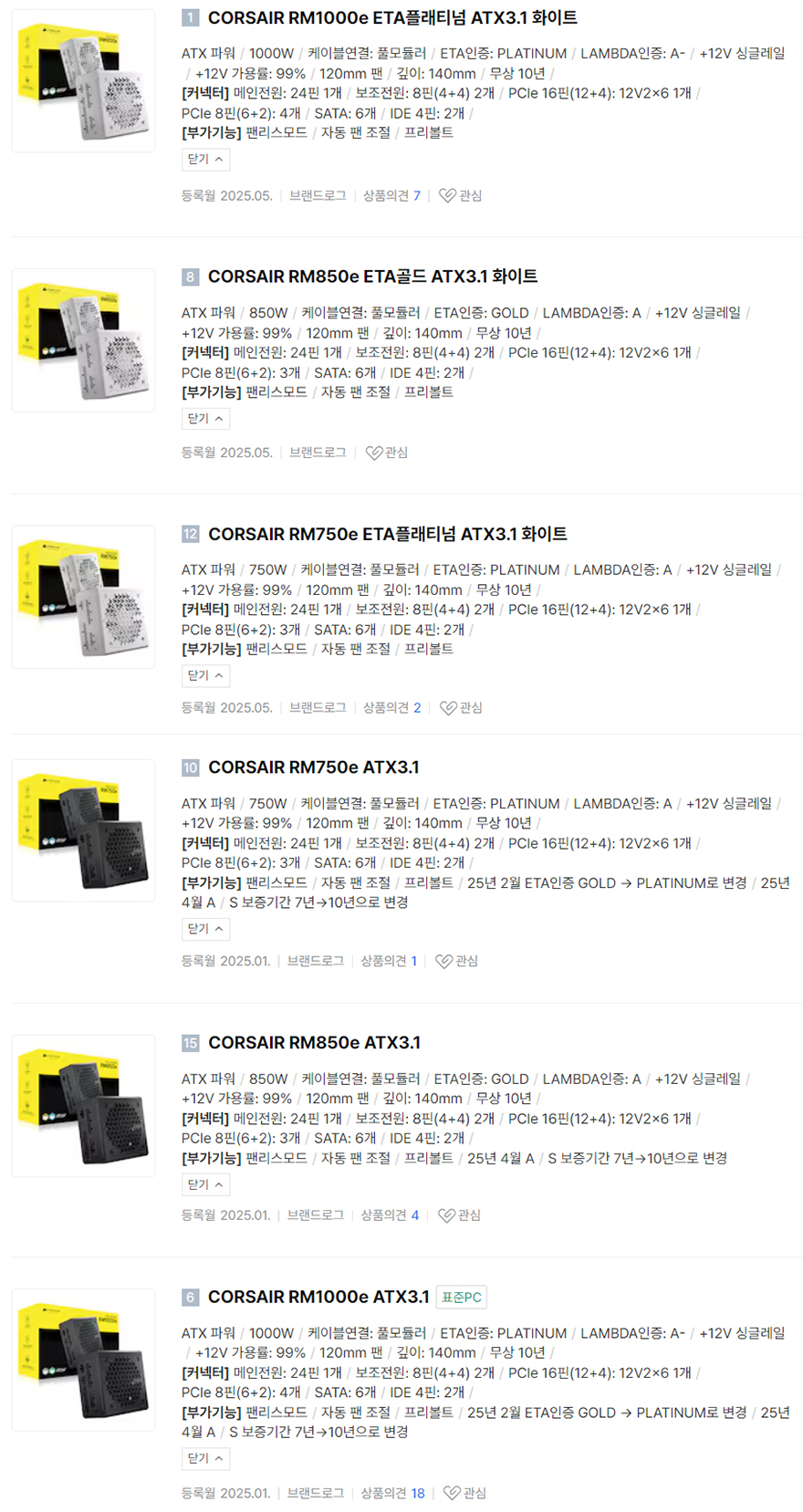 끝으로, 커세어 RMe 시리즈 파워서플라이는 사이버네틱스의 전력효율등급을 받았습니다. 먼저 블랙색상으로 출시해 만났던 850W 용량의 모델 같은 경우 골드 등급에 소음등급도 A 기본 등급을 받았던 반면, RM1000e ATX 3.1 화이트 파워서플라이처럼 1000W 용량은 이보다 한 단계 더 높은 플래티넘 효율등급을 받았습니다. 반대로, 소음은 한 단계 아래인 A- 등급을 받았죠. 물론, 115V와 230V 효율결괏값을 사이버네틱스에 등록된 테스트 자료로 확인해 보면, 230V에서 좀 더 좋은 것을 확인할 수 있죠. 즉, 220V를 사용하는 한국에서는 더 효율적이라 할 수 있습니다. 그리고, 무엇보다 시작에서 언급했듯이 이번 화이트 색상이 추가로 출시되면서, 먼저 출시했던 블랙색상과 함께 이제는 750W, 850W, 1000W 용량에서 소비자가 원하는 색상을 선택할 수 있게 되었습니다.