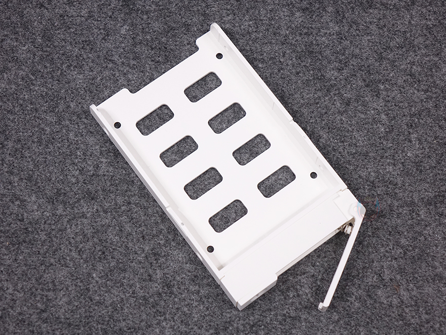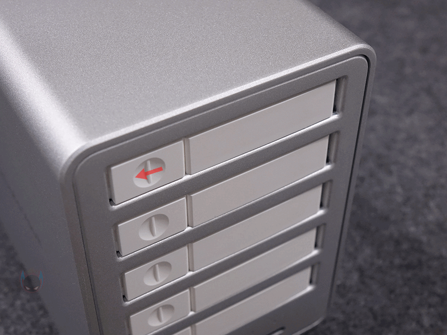 전면에는 저장장치를 장착할 수 있는 각 베이(Bays)들이 배치되어 있는데, 베이 분리는 다른 NAS/DAS 제품들과 유사하게 베이 왼쪽에 있는 버클(buckle) 부분을 왼쪽으로 밀면, 베이 손잡이 부분이 자동으로 튀어나옵니다. 그럼, 손잡이를 잡고 트레이에서 빼내면 되죠. 베이에는 2.5인치 HDD/SSD를 장착할 수 있게 나사홀이 밑바닥 부분과 측면에 각각 처리되어 있으며, 만약 8848RC3, 8858RC3 모델에서 M.2 NVMe SSD를 장착하고 싶다면, 별도의 2.5인치 SATA 어댑터를 장착해줘야 합니다. 또한, 일부 2.5인치 SSD 제품 같은 경우 외형 디자인에 따라 두께가 기본 7~9mm보다 높은 경우가 있는데, 10mm 두께까지는 장착이 가능합니다. 참고로 5-베이 모델은 최대 40TB 용량까지 갖출 수 있습니다.