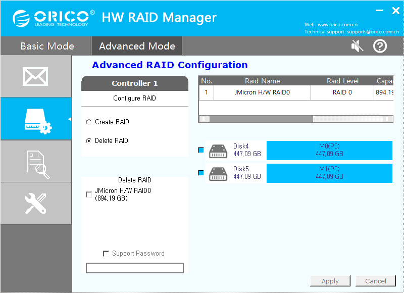 그럼, 직접 오리코(ORICO) MixData Vault DAS를 사용해 보면, 본체 후면에 전원 버튼을 눌러 전원을 켜면 전면 아래에 있는 LED 인디케이터를 통해 장착된 SSD/HDD 인식 상태를 확인할 수 있습니다. 개봉 시 본체 후면 RAID 모드 스위치는 기본(Normal) 설정상태이기 때문에 그대로 사용하면 일반 외장 하드를 연결해서 사용하는 것처럼 각 베이에 장착된 SSD/HDD 즉, 드라이브별로 사용할 수 있죠. 만약, 기본 설정을 제외한 RAID 모드를 선택해서 사용하려면, 본체 후면 RAID 모드 스위치를 설정하거나 공용 RAID 관리 S/W를 통해 RAID 모드를 설정할 수 있습니다. 공용 RAID 관리 S/W는 오리코 홈페이지에서 다운로드(Download) 받을 수 있으며, 프로그램을 설치해 실행해 보면, 메뉴는 크게 기본(Basic) 모드와 고급(Advanced) 모드 2가지로 구분되며, 기본 모드에서는 디스크 정보와 로그 기록, RAID 설정상태를 확인할 수 있고, 고급 모드에서는 이메일을 전송할 수 있는 SMTP 설정, 세부적인 RAID 설정, 펌웨어 업데이트, 대기모드 설정을 할 수 있습니다.