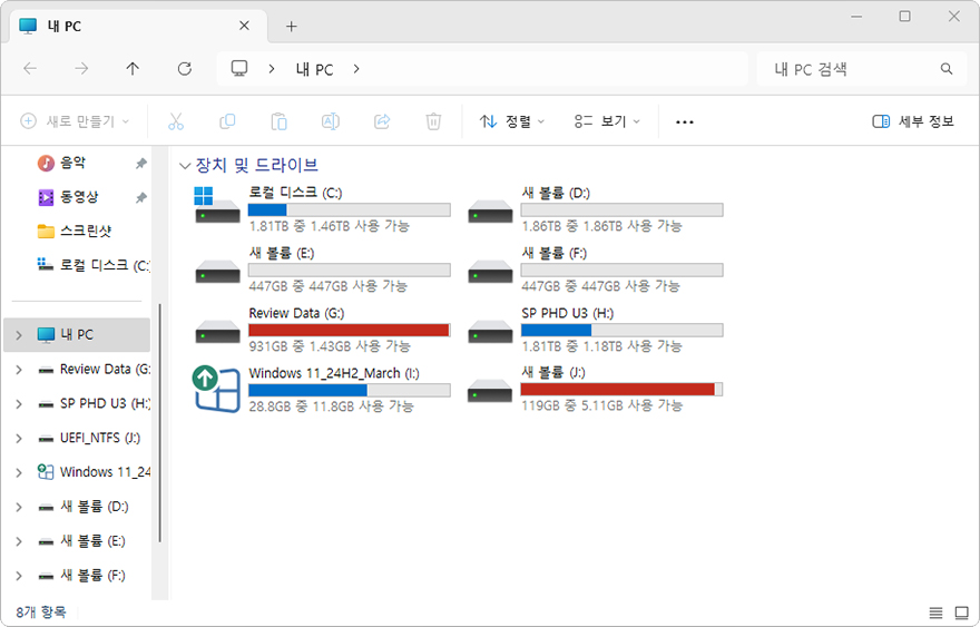 만약, 다수의 저장장치를 RAID 모드로 설정해 사용하고 싶다면, 앞서 본체 후면에서 확인한 RAID 스위치를 설정해서 사용하거나 방금 확인한 공용 RAID 관리 S/W에서 설정해 사용할 수 있습니다. 물론, 좀 더 편리한쪽은 후자 방식으로 공용 RAID S/W를 실행해 기본 RAID 상태 메뉴로 가면, 장착된 저장장치 개수에 따라 선택할 수 있는 RAID 모드가 활성화되어 있습니다. 리뷰에선 간단하게 RAID 0 모드로 선택해 진행해 봤는데, RAID 0 모드는 다수의 저장장치 용량의 하나로 합쳐 사용하는 모드로 모드는 선택하면 초기화 진행 메시지가 나오고, Yes를 선택하면 자동으로 모드 설정 진행을 마칩니다. 모드 설정이 끝나면, RAID 정보에 2개의 저장장치가 합쳐진 용량으로 표시된 걸 확인할 수 있고, 이후에는 정상적인 저장장치 인식을 위해 운영체제에서 포맷을 진행해야 합니다. 윈도우(Windows)를 기준으로 제어판-디스크관리로 들어가서 RAID 0 모드로 합쳐진 디스크를 선택해서 포맷을 진행하면, 합쳐진 용량의 1개 저장장치가 인식되는 걸 확인할 수 있죠. 만약, 설정했던 RAID 모드를 삭제하고 싶을 때는 고급 모드에서 안내에 따라 진행하면 되고, RAID 모드 생성이든 삭제이든 진행 후에는 디스크 관리에서 포맷을 진행해야 저장장치 인식이 됩니다.