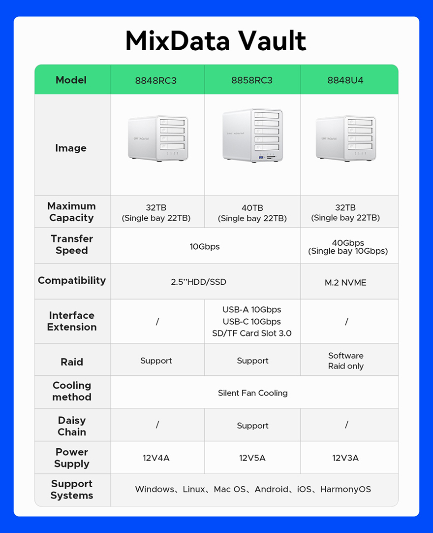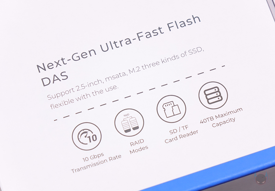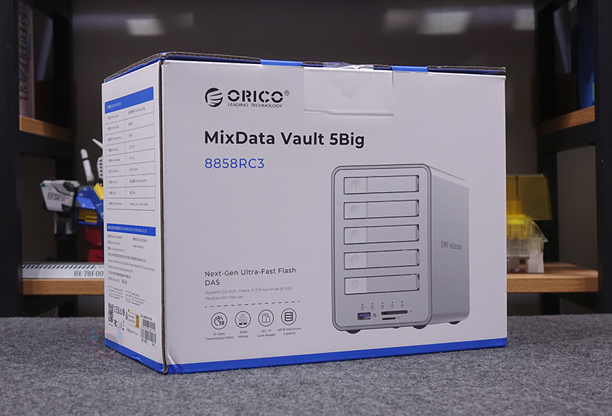 패키지부터 살펴보면, 제품 박스는 다른 DAS 제품들과 마찬가지로 구입시 이동 편의를 위해 손잡이를 갖추고 있으며, 앞뒤로는 동일한 이미지와 내용을 담고 있는데, 한쪽은 중국어, 반대쪽은 영어로 표기되어 있습니다. 오늘 만나볼 MixData Vault 시리즈의 제품 모델은 8858RC3이며, 제품 이미지에서 보면 알 수 있듯이 5-베이(Bay)를 갖추고 있습니다. 뒤에서 다시 언급하겠지만, MixData Vault 시리즈는 4-베이와 5베이 2가지로 구분되고, 모델은 총 3개입니다. 5-베이 모델 같은 경우에는 이미지 옆에 주요 특징으로 표기해 놨듯이, 2.5인치 HDD/SSD를 장착할 수 있고, SD/TF 카드 슬롯을 갖추고 있는 게 특징이고, USB 전송속도와 다양한 RAID 모드 지원, 그리고, 최대 40TB 용량까지 지원하죠.