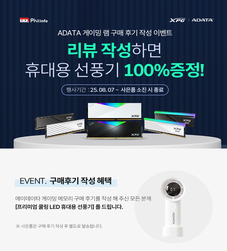 ADATA의 공식 유통사 ㈜파인인포가 여름철을 맞아 컴퓨존 단독 프로모션을 진행한다. 이번 이벤트는 ADATA 게이밍 메모리(XPG 시리즈) 구매 고객을 대상으로 하며, 제품 구매 후 후기 작성 시전원에게 프리미엄 휴대용 선풍기를 증정한다.