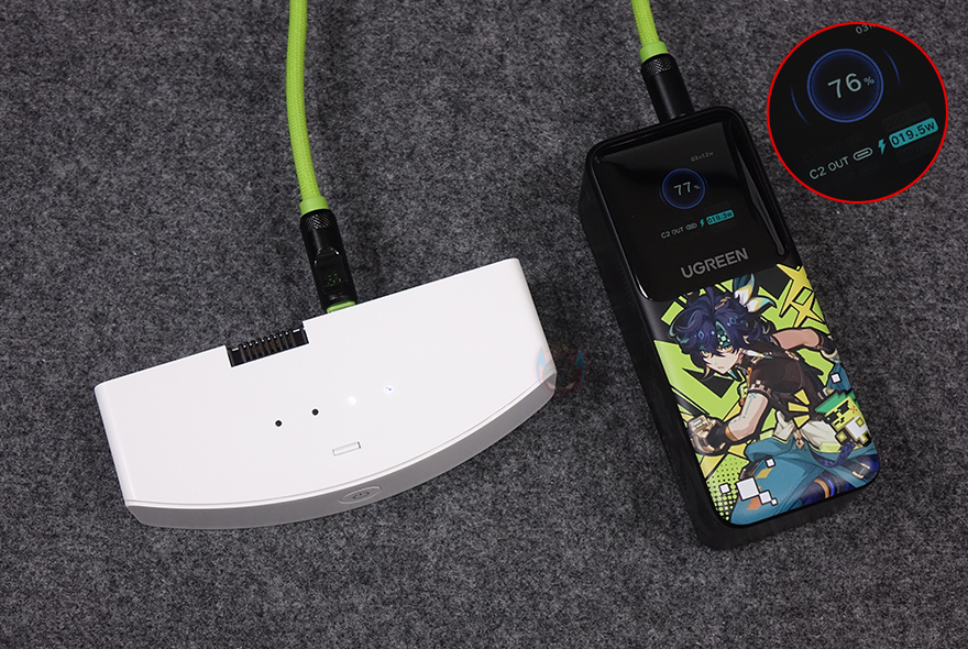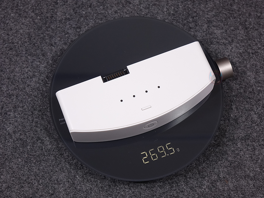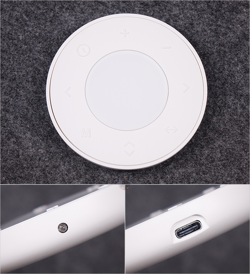 또한, 분리형 배터리 자체에도 상단에 충전하는 동안 배터리 잔량을 확인할 수 있게 LED 인디케이터를 적용했으며, 배터리 충전방식도 USB 타입 C 포트 방식이라 모바일기기처럼 어디서든 손쉽게 충전할 수 있고, 휴대용 보조배터리를 사용해 충전할 수도 있습니다. 참고로, 배터리 용량은 10,200mAh이며, 무게는 약 270g으로 스마트폰보다 약간 무거운 편이라 야외 사용 시 휴대성에도 부담되지 않죠. 스탠드 받침대 밑바닥 부분에는 앞서 확인한 연결봉과 리모컨 수납공간 외에 테두리 주변으로 미끄럼방지 및 진동소음 최소화를 위해 총 7개의 패드를 부착하고 있으며, 리모컨 수납공간 역시 마그네틱 방식으로 탈부착됩니다. 끝으로, 기본 제공되는 충전케이블과 전원어댑터를 살펴보면, 분리형 배터리 충전 시 사용되는 USB 충전케이블은 약 1m 길이에 USB 타입 A to C 인터페이스를 가졌으며, 유선시 사용되는 전원어댑터는 약 1.8m 길이에 최대 소비전력은 30W입니다.
