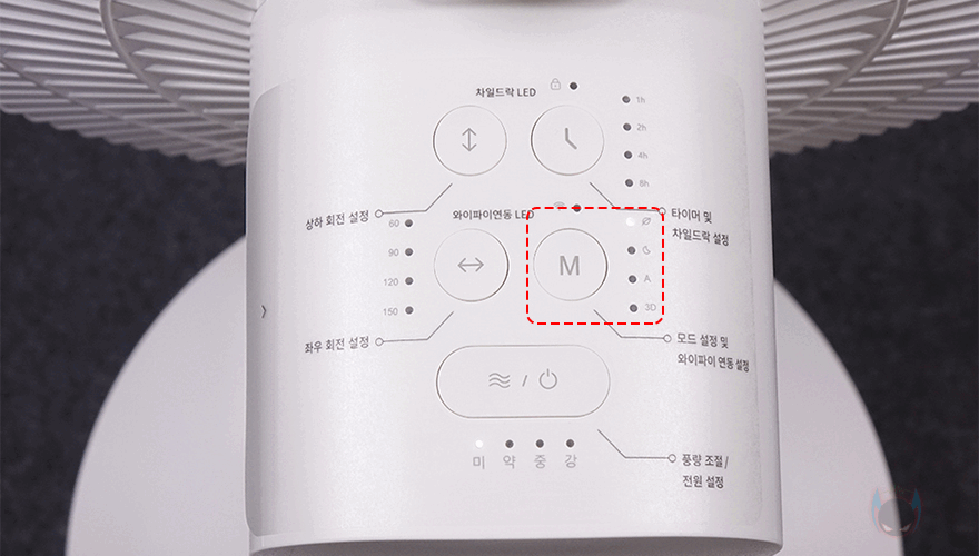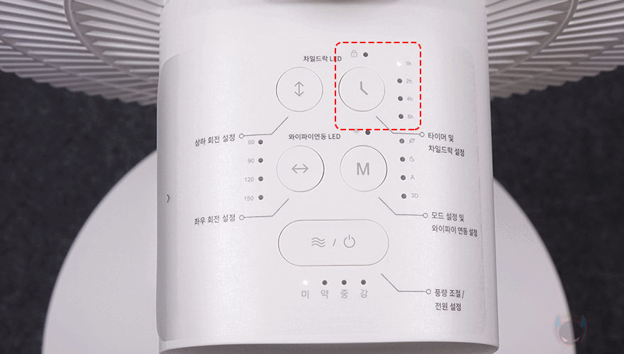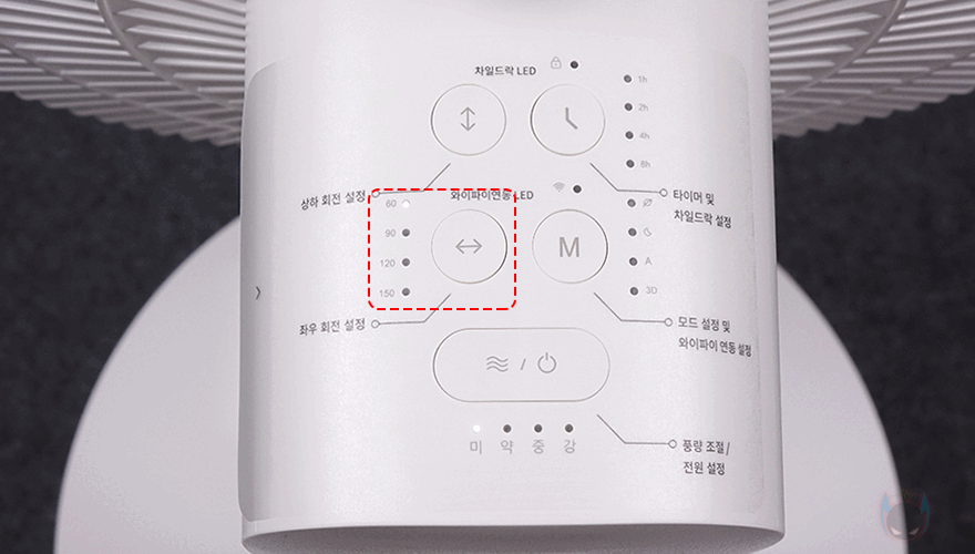 그럼, 헤드 조작부와 무선 리모컨으로 할 수 있는 기능 지원에 대해서 살펴보면, 먼저 풍량조절은 헤드 조작부에서 미/약/중/강풍으로 조절할 수 있으며, 리모컨 사용 시에는 1단계에서 10단계까지 조절이 됩니다. 1~2단계는 미풍, 3~5단계는 약풍, 6~8단계는 중풍, 9~10단계는 강풍으로 구분되죠. 시간 설정의 타이머 같은경우에는 헤드 조작부에서 1/2/4/8/12시간으로 구분되며, 리모컨에서 사용할경우에는 분단위로 60/120/240/480/720 표시해줍니다. 그리고, 헤드 조작부에서 타이머 버튼을 2초이상 누르면 영유아 사용방지를 위한 차일드락 잠금/해제를 할 수 있죠. 수동의 풍량조절외에 자동으로 조절되는 모드 지원은 자연풍/수면/오토/3D 4가지 모드를 지원해주고 있는데, 헤드조작부와 리모컨 모두 같은 표시로 확인할 수 있습니다. 그리고, 각도조절 같은경우에는 좌우 회전은 60/90/120/150˚ 범위로 선택할 수 있으며, 헤드 조작부에서는 각도별로 점등해주고, 리모컨에서는 숫자로 표시해줍니다. 상하 회전은 각도조절없이 -15˚~90˚ 범위로 움직이며, 3D 모드를 선택하면 상하좌우 범위를 자동으로 움직입니다. 개인적으로는 상하회전에 하(下) 각도가 다른 무선 선풍기/서큘레이터보다 좀 더 내려가는 정확히는 일반 선풍기 각도만큼이나 내려가서, 상하 각도조절이 없지만 마음에 들었습니다. 그리고, 3D 모드를 사용하다가 Off하면 자동으로 중앙 위치로 돌아와 작동하며, 상하좌우회전 모두 기능을 작동시킬 때 시작 반응도 비교적 빠른 편입니다.