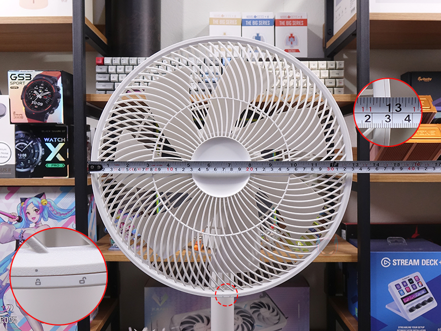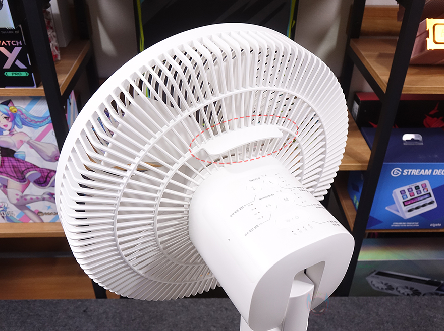 부위별로 좀 더 자세히 살펴보면, 날개와 그릴 안전망이 있는 헤드 부분은 약 33cm 크기로 무선 선풍기/서큘레이터 제품에 표준적인 사이즈로 전면 안전망 아래에는 망 잠금/해제 표시와 함께 아랫부분에 고정나사를 확인할 수 있죠. 다른 선풍기/서큘레이터 제품들처럼 고정나사를 풀고, 전면 안전망을 표시된 해제 위치로 돌리면 분리가 됩니다. 망 안쪽에 장착된 날개는 12인치 크기의 7 엽 날개이며, 날개를 고정하고 있는 중앙에 너트를 역시 표시될 방향으로 돌리면 날개도 분리가 되죠. 그리고, 날개를 분리한 후, 후면 안전망을 고정하고 있는 중앙에 너트 역시 표시된 방향으로 돌리면 분리가 됩니다. 그래서, 다른 선풍기/서큘레이터 제품들처럼 망과 날개 모두가 분리해서 청소를 할 수 있습니다. 또한, 조립된 상태에서는 이동시 편의를 위해 후면 안전망 뒷면에 손잡이도 적용되어 있죠.