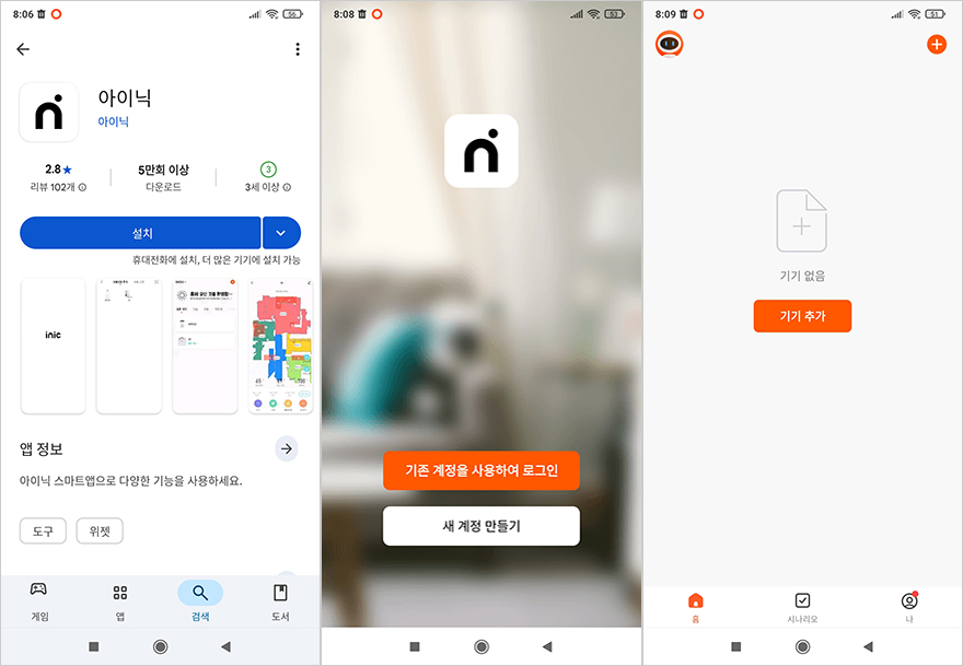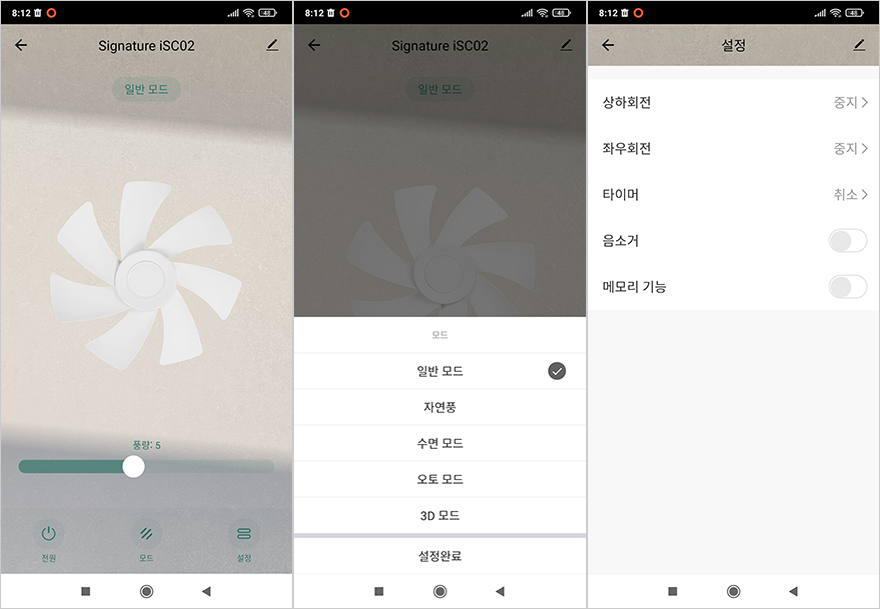 시그니처 iSC02 무선 서큘레이터는 앞서 확인한 헤드 조작부, 무선 리모컨 외에도 앱 연동을 통해서도 기능을 다룰 수 있습니다. 앱 설치 및 연동, 사용법은 제공되는 제품 설명서에도 상세하게 담고 있기 때문에 초보자도 어렵지 않게 따라 할 수 있습니다. 먼저, 사용하는 스마트폰에 따라 앱 스토어 또는 구글 스토어에서 '아이닉'을 검색해 앱을 설치하고, 실행해서 계정을 만들어줍니다. 그리고, 앱에서 기기추가를 해주기 전에 헤드 조작부에 있는 모드(M) 버튼을 3초 이상 누르면 앱 연결을 위한 Wi-Fi 모드가 작동되는데, Wi-Fi 주파수는 다른 스마트 가전제품들처럼 2.4G로만 연결이 가능하고, Wi-Fi 모드가 작동되면 기기추가 진행과 함께 Wi-Fi 연결을 해주면 앱 연동이 완료됩니다. 앱과 연동이 되면 헤드 조작부와 무선 리모컨에서 다루었던 기능들을 앱에서도 그대로 다룰 수 있는데, 메인 화면에 전원/모드/설정 3가지 메뉴를 확인할 수 있고, 전원이 켜지면 메인화면에 날개 이미지도 함께 움직입니다. 모드 메뉴에서는 일반/자연풍/수면/오토/3D 모드를 선택할 수 있고, 설정 메뉴에서는 상하회전, 좌우회전, 타이머 기능 외에 기기 알림음을 끌 수 있는 음소거와 마지막으로 사용했던 기기 사용모드를 기억할 수 있는 메모리 기능을 활성화시킬 수 있습니다.