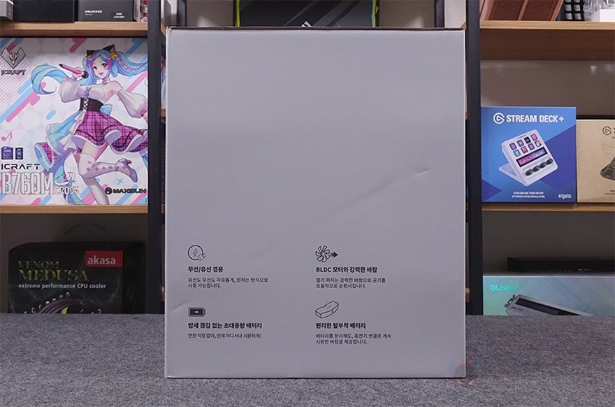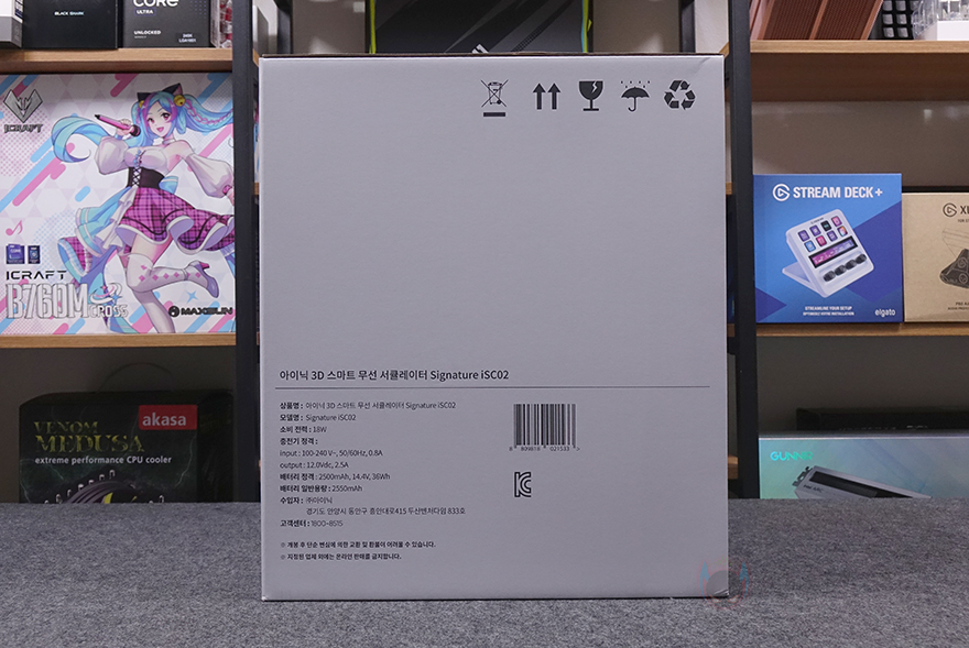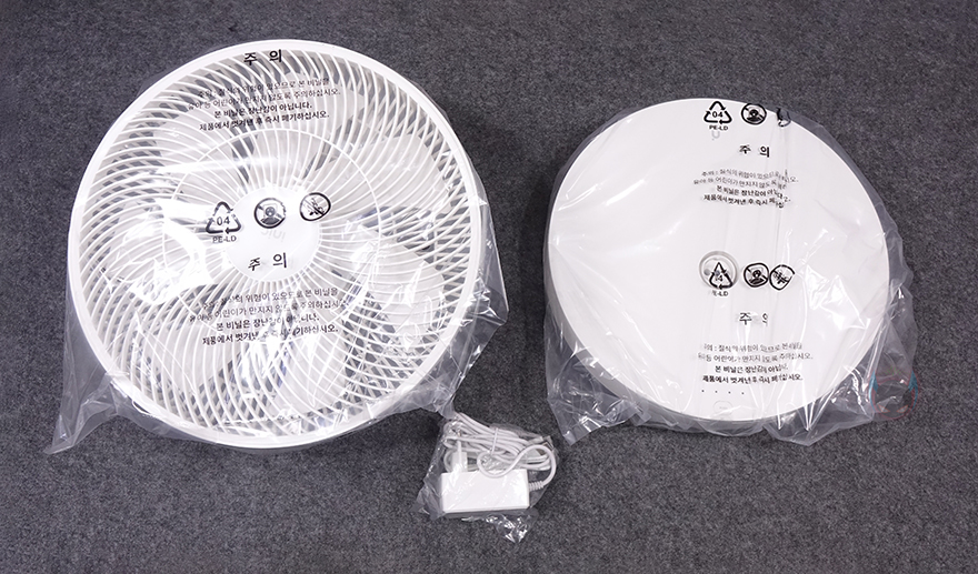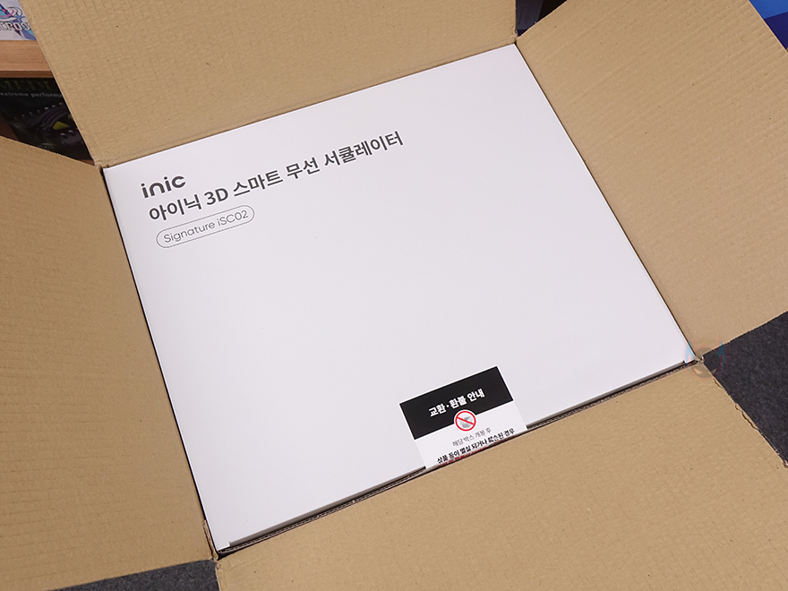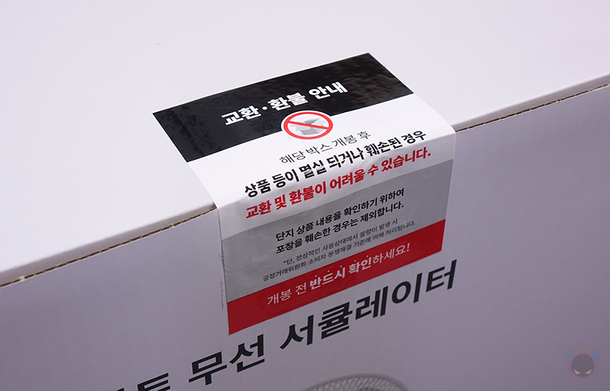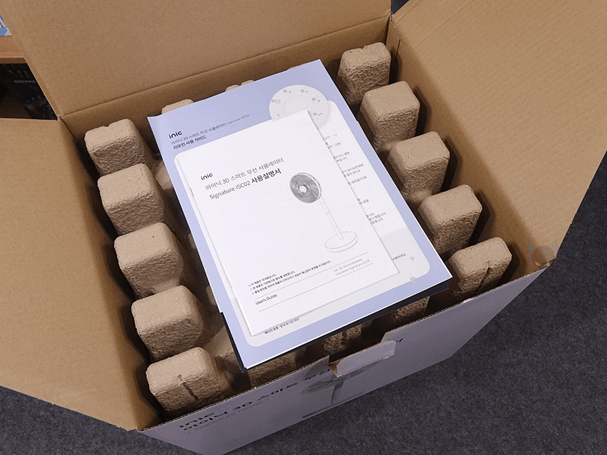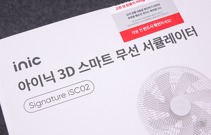 제품패키지인 박스부터 살펴보면, 중소업체 제품이지만 포장에 상당히 신경을 잘 쓴 모습입니다. 그리고, 일반적인 선풍기/서큘레이터 제품박스는 긴 편인데, 이 제품의 정사각형으로 부피도 작죠. 또한, 택배 배송박스까지 포함하면 총 3번의 박스 포장이 적용되어 있는데, 택배 박스에서 꺼내 먼저 확인되는 박스는 제품 기본 포장 박스로 보통 이런 포장 박스를 갖추면 이 상태로 배송되는 경우가 많은데, 아이닉은 여기에 한 번 더 택배 배송박스를 적용해서 보내주고 있습니다. 그리고, 포장 박스에는 제품 모델명과 이미지, 간략한 사양 등을 표기해 놨고, 박스 상단 개봉 부분에는 제품 교환 및 환불, A/S 관련 안내 문구도 확인할 수 있죠.