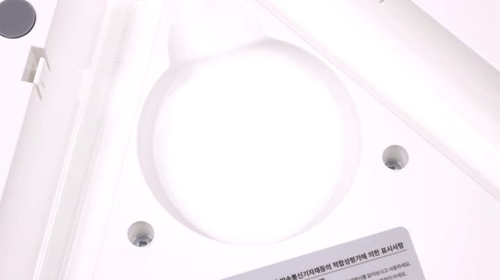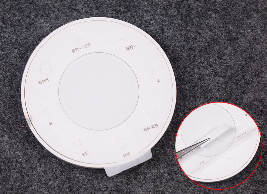 헤드 후면은 모터 부분으로 모터는 당연히 무선 제품답게 BLDC(브러시리스)를 사용했습니다. 이제는 대부분의 가전제품에서는 전력효율을 위해 BLDC 모터를 사용하는 추세죠. 또한, 헤드 아래 중앙쯤에는 바로 뒤에서 확인하겠지만, 무선 리모컨의 신호를 받는 수신기가 적용되어 있습니다. 모터 외부 바깥 부분 상단에는 조작부가 배치되어 있는데, 개봉 시에는 각 버튼의 기능을 표시한 투명 스티커가 부착되어 있습니다. 스티커를 떼고 바로 사용해도 되지만, 투명 스티커라 크게 거슬리지 않아서 어느정도 기능을 숙지한 뒤에 떼어내도 상관없습니다. 버튼은 총 5개 구성이며, 헤드 상단 조작부가 불편한 사용자를 위해 무선 리모컨도 제공이 되죠. 무선 리모컨 역시 개봉시 버튼 표기 스티커가 부착되어 있으며, 원형 디자인에 총 8개 버튼 구성을 하고 있습니다. 뒤에서 사용할 때 확인하겠지만, 리모컨 중앙에는 업계 최초로 디스플레이까지 적용해서 사용자가 버튼 사용과 동시에 작동상태를 확인할 수 있습니다. 리모컨 측면 위쪽에는 앞서 확인한 헤드 부분의 수신기와 연결되는 송신기가 배치되어 있고, 측면 아래쪽에는 충전할 수 있는 USB 타입 C 포트가 배치되어 있습니다. 또한, 무선 리모컨 사용 시 분실방지를 위해 마그네틱 방식을 적용해 전면 안전망 중앙에 탈부착할 수 있도록 했죠. 참고로 리모컨은 한 번 완충 후 최대 120일 사용할 수 있습니다.