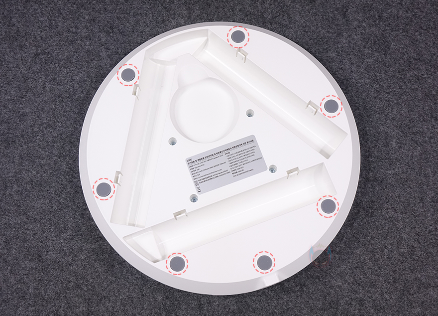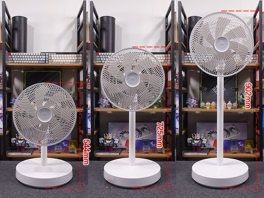 조립까지 마치면, 이제 본격적으로 아이닉 시그니처 iSC02 무선 서큘레이터를 살펴보는데, 색상은 전체적으로 화이트 계열이며, 방금 조립과정에서 언급했듯이 헤드와 스탠드받침대를 있는 연결봉을 통해 높낮이 조절을 할 수 있습니다. 연결봉 하나만 사용했을 때는 약 544mm로 탁상용처럼 저상형 침대 및 매트리스에서 사용하기 유용하며, 2개를 연결했을 때는 약 725mm로 일반적인 선풍기/서큘레이터 기본 높이로 사용할 수 있고, 3개를 연결했을 때는 약 902mm로 에어컨 사용 시 찬 공기 순환용으로 사용하기 적합하죠. 그리고, 사용하지 않는 연결봉은 스탠드받침대 밑바닥에 수납하면 되기 때문에 분실 우려도 없습니다.