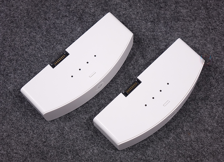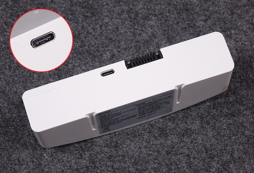 이번에는 스탠드 받침대를 살펴보는데, 앞쪽에는 심플하게 아이닉 로고만 새겨놨으며, 같은 위치 뒤쪽에는 배러티 잔량을 확인할 수 있는 LED 인디케이터와 함께 푸시(PUSH)이 배치되어 있습니다. 개봉시 푸쉬 버튼 바로 뒤에는 분리형 배터리가 기본 장착되어 안내문구 스티커가 부착되어 있으며, 배터리 삽입구 바로 아래에는 전원어댑터와 연결되는 DC 포트가 배치되어 있죠. 푸쉬 버튼을 누르면 장착된 배터리가 자동으로 잡을 만큼 적당한 위치로 튀어나와 쉽게 분리할 수 있습니다. 참고로 이 분리형 배터리는 아이닉 공식판매처(https://brand.naver.com/inic/products/11811359980)에서 소비자가 추가로도 구입이 가능해서, 최소 2개를 구비하고 있으면 번갈아가면서 계속 무선상태로 사용할 수 있습니다. 즉, 기존에 배터리가 내장된 제품들은 배터리가 다 소모되면 전원어댑터를 사용해 충전하는 동안 유선으로 사용해야 하는 불편함이 있었는데, 시그니처 iSC02는 분리형이라 최소 2개 구비하고 있으면 계속 무선으로 사용할 수 있다는 거죠.