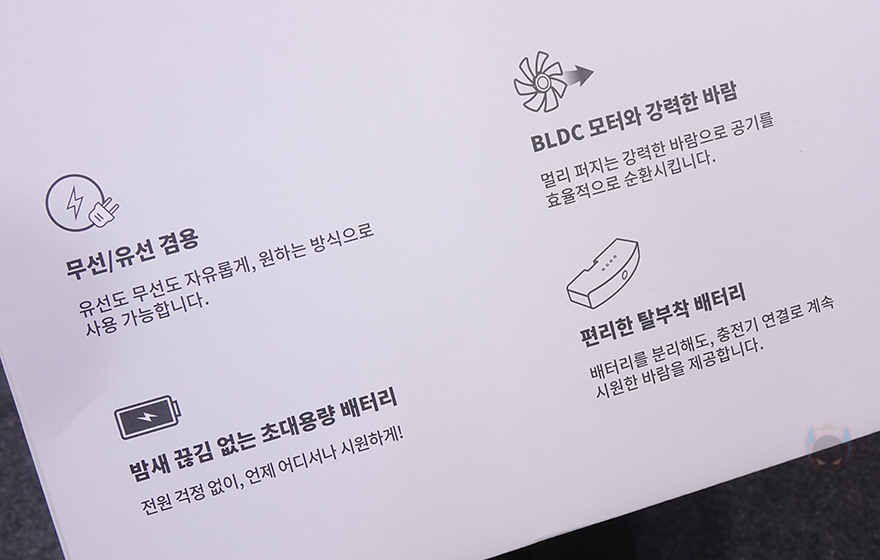 그리고, 포장 박스를 열어보면, 이제 진짜 제품 박스 그러니깐 디자인이 적용된 패키지 박스를 확인할 수 있습니다. 흰색 배경의 제품 박스에는 포장 박스와 유사하게 전면과 후면에 각각 모델명과 함께 제품 이미지를 담고 있는데, 전면에는 제품 정방향, 후면에는 제품 후면과 측면 이미지를 담고 있죠. 또한, 박스 한쪽 측면에는 제품의 주요 특징으로 유무선 겸용 지원, BLDC 모터, 초대용량 배터리, 탈부착 배터리를 언급하고 있으며, 반대쪽 측면에는 포장 박스에서 봤던 제품의 기본 사양 표기를 한 번 더 확인할 수 있습니다. 그리고, 박스 개봉부분에는 동봉씰 스티커와 교환/환불 안내 문구를 확인할 수 있죠.