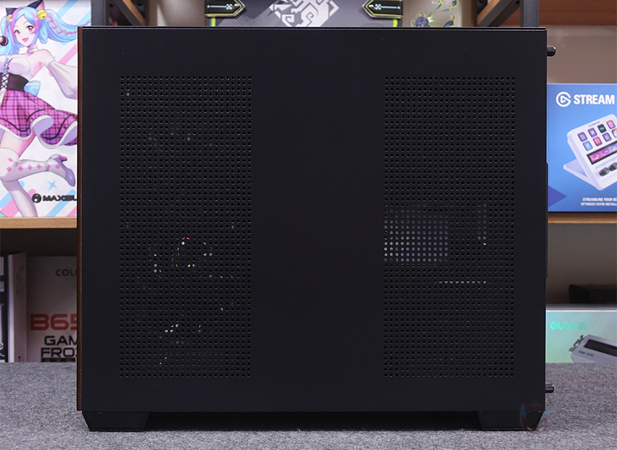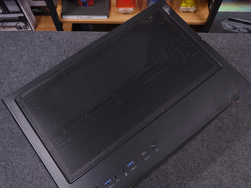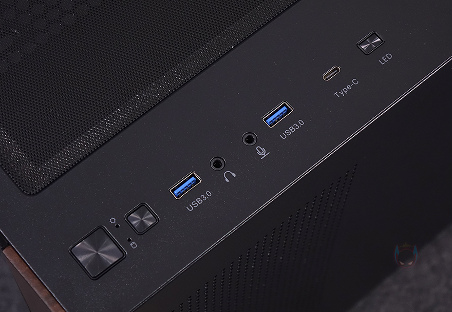 케이스 상단에는 분리형 먼지필터가 장착되어 있는데, 자석방식으로 쉽게 탈부착을 할 수 있으며, 필터를 분리하면 내부 상단 쿨링시스템을 갖출 수 있게 벌집 모양의 에어홀과 나사홀이 처리되어 있습니다. 쿨링 지원은 팬 장착시 140mm는 최대 2개, 120mm는 최대 3개를 장착할 수 있으며, 수랭쿨러 사용 시에는 최대 360mm 라디에이터를 장착할 수 있죠. 그리고, 전면 우드 패널과 같은 위치선상에 있는 상단 오른쪽 자리에는 버튼 및 포트들이 배치되어 있는데, 맨 앞에서부터 전원 버튼, 리셋 버튼, USB 3.0 포트, 오디오 포트, 마이크 포트, USB 3.0 포트, USB 타입 C 포트, LED 버튼순으로 적용되어 있습니다.