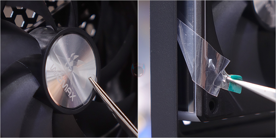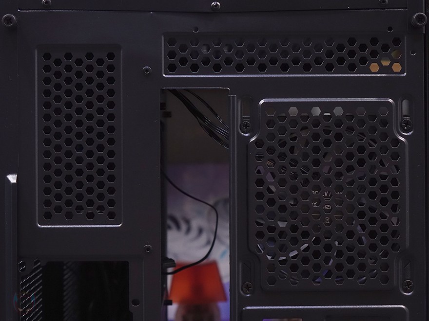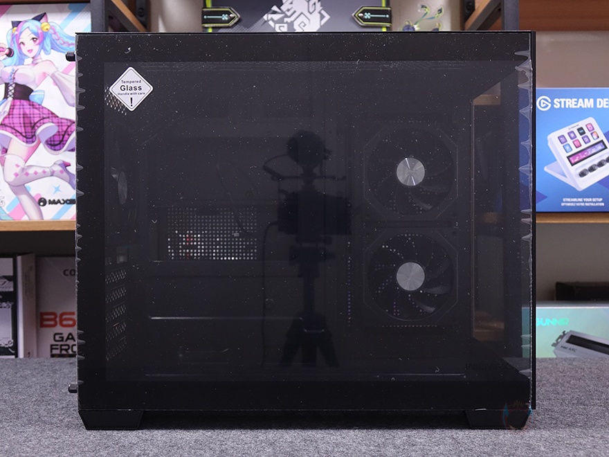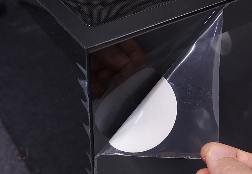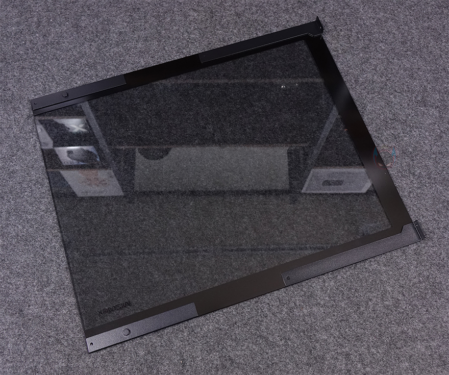 전면 기준 왼쪽 측면 패널 역시 강화유리 패널로 전면에서 측면으로 이어지는 파노라마-뷰 형성으로 전형적인 컴퓨터 어항케이스 특징이며, 역시 개봉시 보호비닐이 부착되어 있습니다. 그리고, 패널은 후면 위아래 손나사 고정으로 나사를 풀고 뒤로 밀면 쉽게 분리가 됩니다. 분리된 강화유리 패널 안쪽에는 파손방지를 위해 새시 프레임이 적용되어 있죠. 또한, 반대편인 오른쪽 패널 역시 후면 손나사 고정이며, 내부가 듀얼 챔버 구조를 가졌기 때문에 새시 양쪽으로 에어홀 디자인을 적용했습니다.