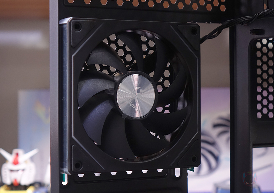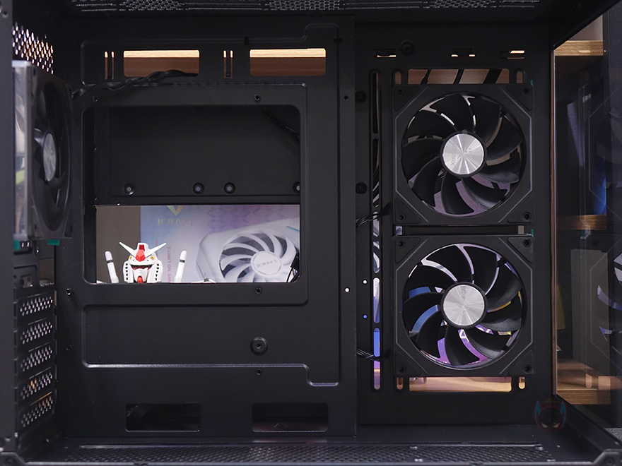 그럼, 이제 마이크로닉스 위즈맥스 우드리안 프로 PC케이스의 내부를 살펴보는데, M-ATX 메인보드부터 장착되는 미니타워이기때문에 내부 구조 역시 케이스 크기에 따라 작은 편이며, 메인보드가 장착되는 트레이 부분에는 CPU-컷-아웃을 비롯해 주변으로 케이블 정리를 할 수 있는 선정리홀이 처리되어 있고, 트레이 기준 맨 오른쪽에는 측면 쿨링 시스템으로 120mm 팬이 기본 장착되어 있습니다. 듀얼 챔버 구조의 컴퓨터 어항케이스 특성상 측면 쿨링시스템은 외부 공기를 흡입하는 역할로 팬 역시 이에 따라 역방향 날개의 리버스 팬이 적용되었고, ARGB 팬을 적용했습니다. 참고로, 기본 장착된 120mm 팬에 140mm 팬까지 교체 장착할 수 있게 지원하고 있죠. 후면 배기역할의 120mm 팬 역시 측면 쿨링시스템의 팬 날개와 반대인 정방향을 제외하고는 동일한 모델로 적용되었으며, 개봉 시 팬 중앙과 측면에 보호비닐이 부착되어 있습니다. 그리고, 후면 팬 아래 PCI 슬롯 가이드는 모두 일회용으로 적용되었고, 내부 하단에는 앞서 외부에서 잠깐 언급했듯이 추가 하단 쿨링 시스템을 갖출 수 있는데, 120mm 팬을 최대 3개 장착할 수 있습니다. 또한, 맨 앞자리 팬 자리에는 팬 대신에 3.5인치 HDD를 1개 장착할 수 있게도 지원하고 있으며, 팬 3개를 모두 사용한다면, 바로 뒷자리 그러니깐 측면 쿨링 시스템 맨 아래 자리에 2.5인치 SSD/HDD를 1개 장착할 수 있게 지원하고 있습니다.