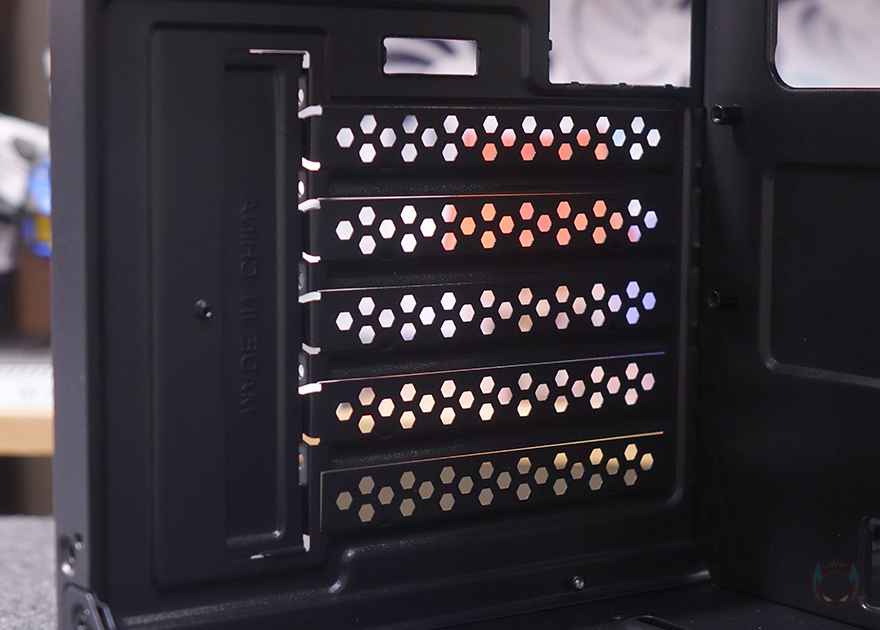 케이스 후면에는 앞서 언급했던 메인보드 후면에 저장장치와 파워서플라이 장착되는 듀얼 챔버 내부 구조를 미리 확인할 수 있으며, 후면 오른쪽에는 전형적인 배기 역할의 에어홀 처리와 함께 내부에 120mm 팬이 기본 장착된 것을 미리 확인할 수 있습니다. 또한, 내부 상단 쿨링 시스템을 갖추는 여유 공간만큼도 후면에 에어홀 처리를 해놨죠. 그리고, 배기홀 및 팬 아래에는 PCI 슬롯이 배치되어 있는데, 미니타워 기준 4개보다 1개 더 많은 5개를 적용했으며, PCI 슬롯과 같은 위치에 맨 왼쪽 자리에는 내부 파워서플라이 자리이며, 위에는 저장장치 자리가 되겠습니다.