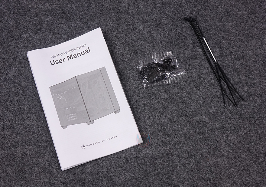 박스를 열어 제품 포장을 확인해보면, PC케이스 기본 포장 방식이라 할 수 있는 외부 충격보호를 위한 스티로폼 완충재와 비닐 포장을 확인할 수 있으며, 우드리안 프로 PC케이스를 제외한 나머지 구성품에는 제품 설명서, 부품 장착에 필요한 나사들, 케이블 정리에 사용되는 소량의 케이블 타이를 제공해주고 있죠.