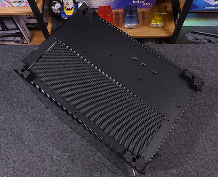 외형 끝으로, 위즈맥스 우드리안 프로 PC케이스 밑바닥부분에는 모서리 부근으로 약 20mm 높이의 받침대가 기본 패드 부착과 함께 적용되어 있으며, 강화유리 패널 쪽 내부 하단 자리 외부에는 역시 자석방식의 먼지필터가 장착되어 있는데, 필터를 분리하면 상단과 마찬가지로 에어홀 처리와 함께 하단 쿨링 시스템을 갖출 수 있게 나사홀이 적용되어 있죠. 또한, 뒤에서 확인하겠지만, 내부 하단 앞자리 한쪽에는 저장장치도 장착할 수 있게 나사홀이 처리되어 있습니다.