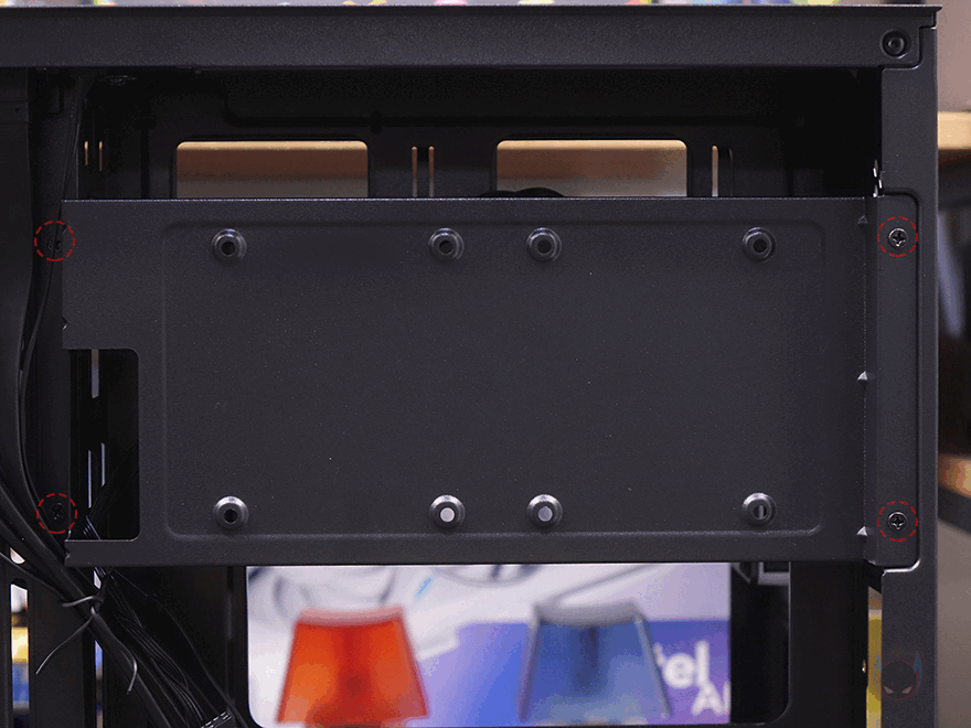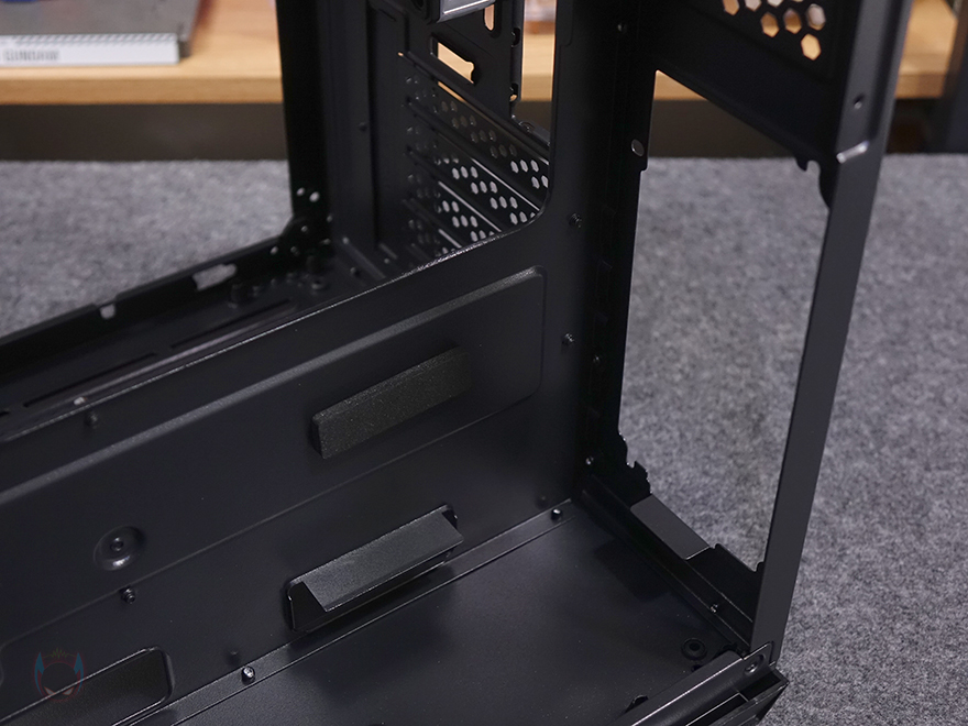 메인보드 트레이 후면 공간 즉 파워서플라이와 저장장치가 장착되는 공간에는 위쪽에 저장장치를 장착할 수 있는 브래킷이 장착되어 있는데, 양쪽 고정된 나사를 풀면 쉽게 분리가 가능하고, 브래킷에는 바깥쪽에 2.5인치 SSD/HDD를 최대 2개 장착할 수 있고, 안쪽 후면에는 3.5인치 HDD를 1개 장착할 수 있게 지원하고 있습니다. 그리고, 아래 파워서플라이 자리에는 받침대와 함께 측면 패드도 부착되어 있죠. 또한, 측면 쿨링시스템 자리 후면 공간은 약 40mm로 저장장치/파워서플라이 자리 공간과 함께 적절한 선정리 공간으로 활용할 수 있습니다.