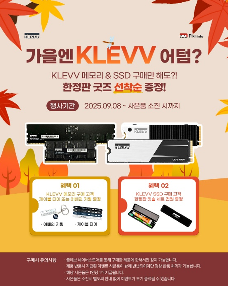 메모리 및 스토리지 전문 유통사 파인인포가 가을을 맞아 공식 유통 브랜드 KLEVV(클레브) 제품 구매 고객을 대상으로 한정판 굿즈 증정 이벤트를 진행한다.