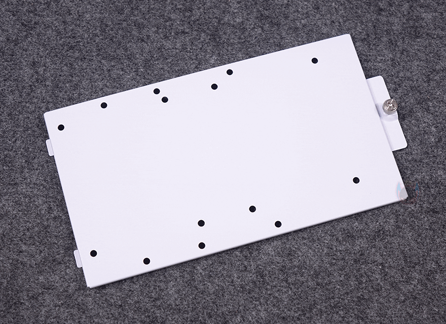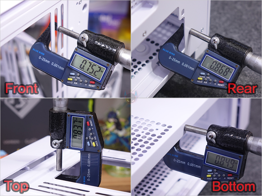 저장장치 같은경우에는 CPU-컷-아웃 홀 위치에 브래킷이 장착되어 있는데, 왼쪽 손나사를 풀면 쉽게 분리가 되고, 브래킷에는 바깥쪽으로 2.5인치 SSD/HDD 2개, 안쪽으로 3.5인치 HDD 1개를 장착할 수 있습니다. 그리고, CPU-컷-아웃 홀 바로 아래에도 추가로 2.5인치 SSD/HDD를 1개 더 장착할 수 있게 브래킷이 장착되어 있죠. 그리고, 내부 하단 공간 앞자리에는 앞서 외형 케이스 밑바닥에서 잠깐 언급했듯이 HDD 베이가 장착되어 있는데, 밑바닥에 고정나사를 풀면 쉽게 분리가 되고, HDD 베이 안쪽에는 3.5인치 HDD 1개를 장착할 수 있고, 베이 바깥쪽 상단에는 추가로 3.5인치 HDD 1개 또는 2.5인치 SSD/HDD를 2개 장착할 수 있습니다. 또한, HDD 베이 자리 이동도 좌우로 약간 할 수 있어서 깊이 길이가 긴 파워서플라이를 사용할 때 좀 더 선정리 공간 확보를 할 수 있게 해 줍니다. 이 밖에 버튼과 포트 케이블들도 케이스 색상에 맞춰 적용했으며, 끝으로 위즈맥스 ML-360 WIDE BTF PC케이스에 사용된 새시 두께를 가장 얇은 부위만 찾아 측정했을 때 일부는 0.7mm 대이고, 대부분 0.80mm 대 두께를 가졌습니다.