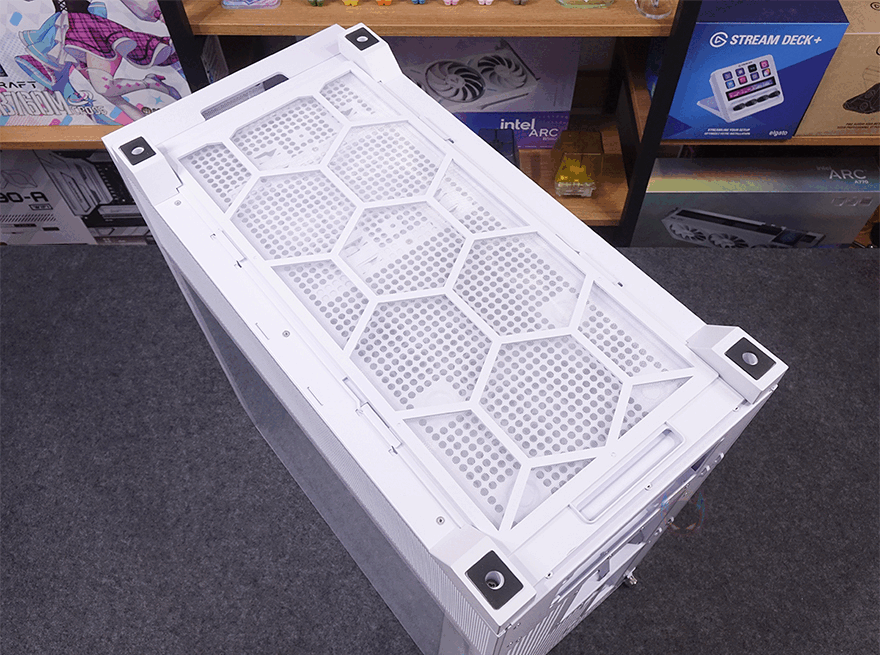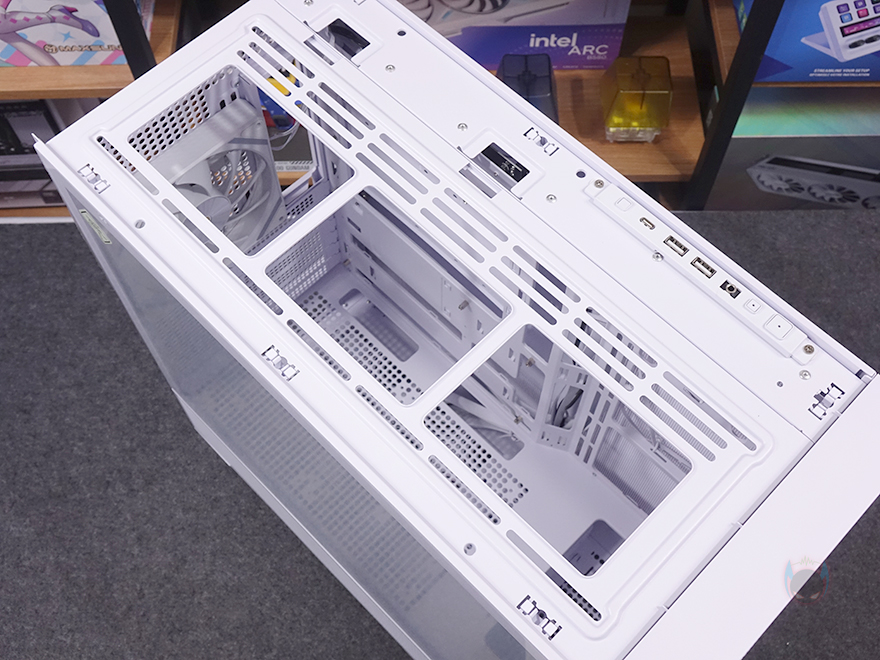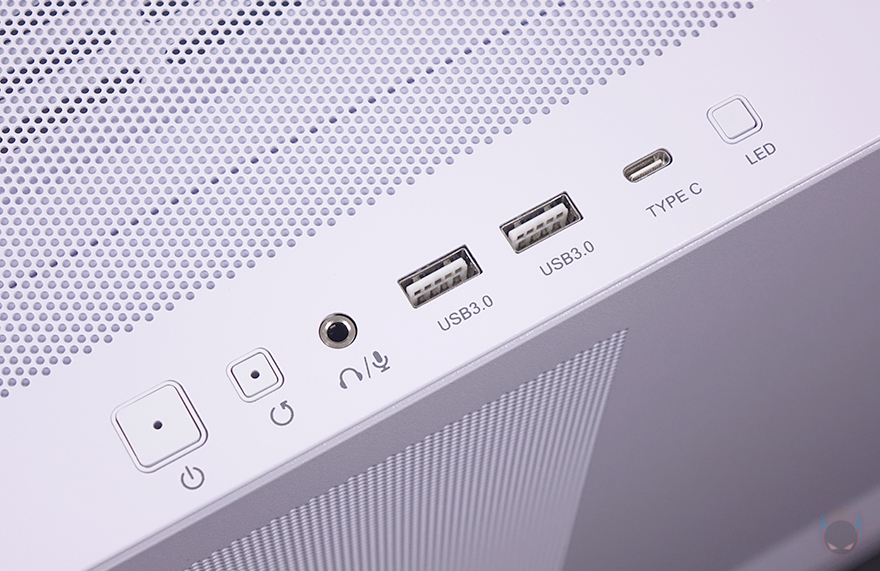 위즈맥스 ML-360 WIDE BTF PC케이스 상단 역시 사이드 패널처럼 볼헤드-핀 고정 방식이라 쉽게 분리가 가능하고, 상단 패널에도 쿨링효과를 위해 메쉬 디자인을 적용했으며, 추가로 내부에 쿨링시스템을 갖출 수 있게 나사홀도 처리되어 있죠. 물론, ML-360 WIDE VIEW BTF 모델과 동일한 구조라 팬 장착 시 140mm는 최대 2개, 120mm는 최대 3개를 장착할 수 있고, 수랭 쿨러시 최대 360mm 라디에이터를 장착할 수 있습니다. 특히, 상단 주변에도 케이블 연결 및 정리를 위해 홀 처리가 일부 적용되어 있죠. 그리고, 앞서 언급했듯이 버튼과 포트는 상단에 배치되어 있는데, 맨 오른쪽 가장자리에 배치되어 앞에서부터 전원버튼, 리셋버튼, 마이크/오디오 포트, USB 3.0 포트 2개, USB 타입 C 포트, LED 버튼 순으로 적용되어 있죠. 특히, USB 타입C 포트는 USB 3.2 Gen2x2 규격을 적용하고 있어서 외장 SSD를 연결해 사용하기 좋습니다.