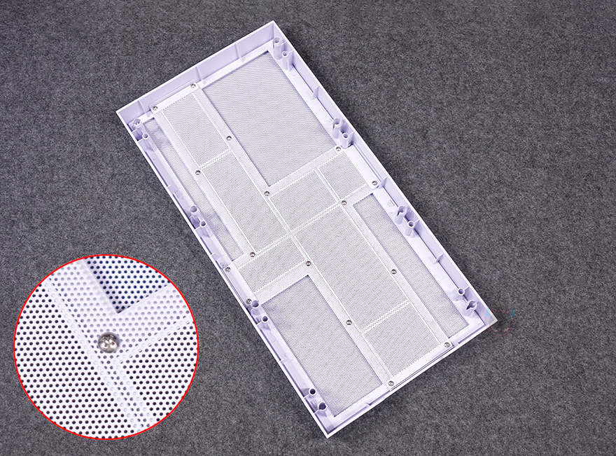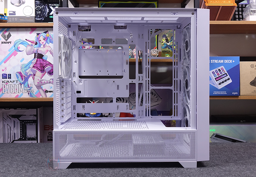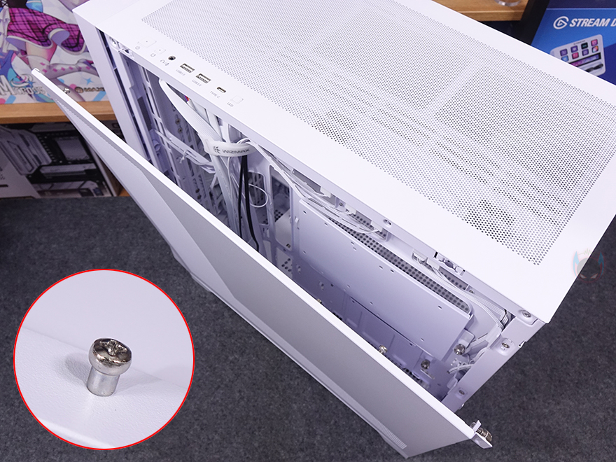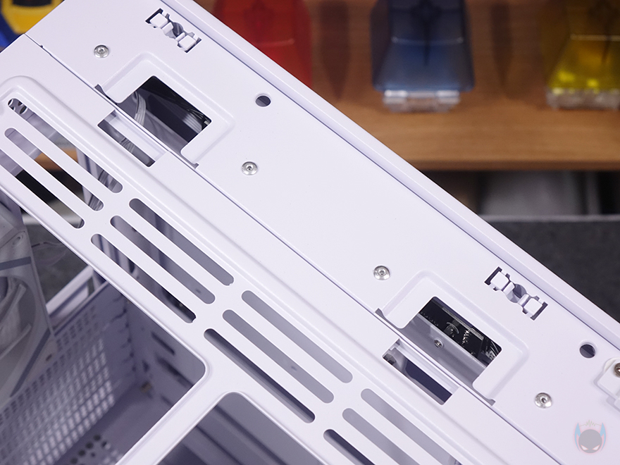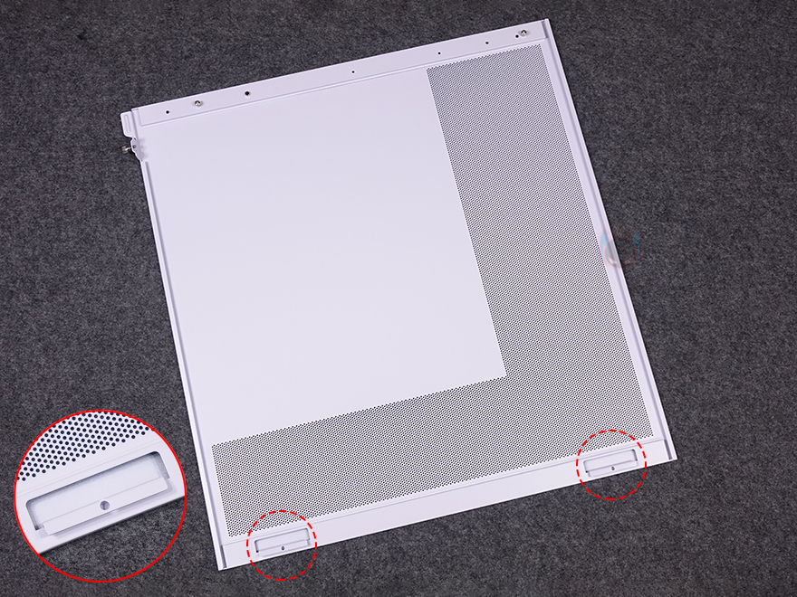 사이드 패널 같은경우에는 ML-360 WIDE VIEW BTF와 유사하지만, 약간 차이가 있습니다. 전면 기준 왼쪽 패널 같은 경우 동일하게 강화유리 패널을 사용하고 있으며, 내부 하단 구간과 구분되는 영역에는 메쉬 디자인 새시 패널을 적용하고 있죠. ML-360 WIDE VIEW BTF 모델에선 바로 이 측면 부분에 전원 버튼을 비롯한 포트들이 배치되었는데, 이번 ML-360 WIDE BTF에서는 전체가 메쉬 패널입니다. 뒤에서 확인하겠지만, 버튼과 포트는 상단에 배치되었죠. 강화유리 패널은 후면 윗부분에 손나사를 풀면 분리할 수 있는데, 강화유리 패널 윗부분 안쪽 프레임으로 볼-헤드핀 클램프 방식도 적용되어 있습니다. 또한, 후면 쪽 테두리 부분에는 닫을 때 충격보호를 위해 패드도 부착되어 있죠. 그리고, 아래 메쉬 패널 부분은 ML-360 WIDE VIEW BTF와 동일하게 내부 안쪽에 있는 고정 나사를 풀면 분리가 됩니다. 반대편인 오른쪽 패널은 ML-360 WIDE VIEW BTF와 똑같이 내부 측면과 하단 구간에 맞춰서 L자 메쉬 디자인을 적용했으며, 오른쪽 패널 역시 후면 손나사 고정과 안쪽 핀 고정 방식을 적용하고 있는데, 아랫부분에는 ㄷ자 걸쇠도 적용되어 있어서 패널 윗부분가 열었을 때도 떨어지지 않고 지탱해 줍니다.