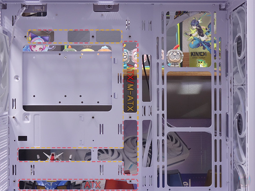 이제, 마이크로닉스 위즈맥스(WIZMAX) ML-360 WIDE BTF PC케이스의 내부를 살펴보는데, 내부 구조 역시 먼저 출시한 위즈맥스 ML-360 WIDE VIEW BTF와 거의 동일하지만 쿨링 시스템 지원에 차이가 있기 때문에 약간의 차이가 있습니다. 일단, 메인보드가 장착되는 트레이 부분은 동일하며, 메인보드 커넥터가 후면에 배치되는 일명 BTF 메인보드까지 장착할 수 있게 홀-처리가 되어 있는데, ATX와 M-ATX 모두 지원하죠. 그리고, 트레이 앞부분 내부 측면부에는 추가 쿨링시스템을 갖출 수 있게 큼지막한 에어홀과 나사홀이 적용되어 있는데, 먼저 출시했던 ML-360 WIDE VIEW BTF에서는 바로 이 부분에 기본 팬이 장착되었죠. 참고로, 측면 쿨링 지원으로 팬 장착 시 140mm는 최대 2개, 120mm는 최대 3개를 장착할 수 있습니다.