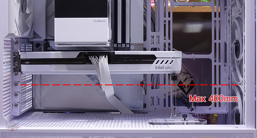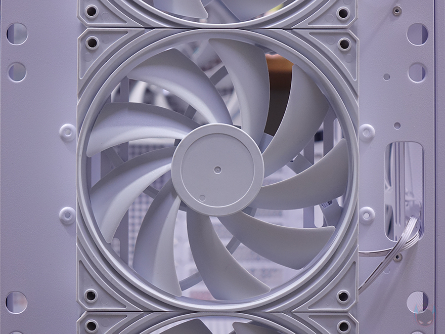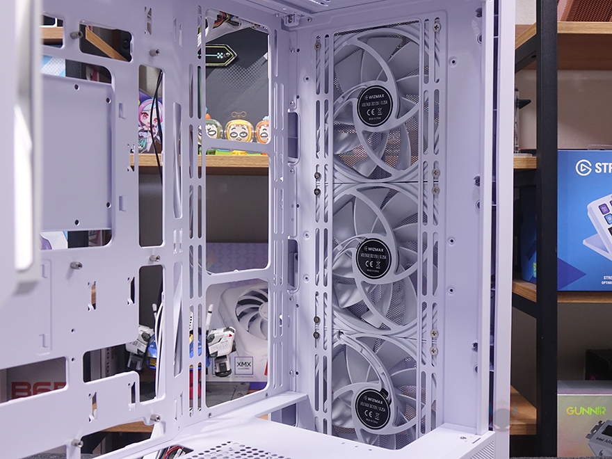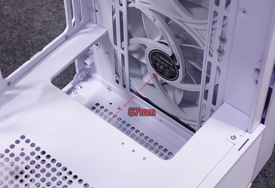 그리고, 방금 언급했던 위즈맥스 ML-360 WIDE BTF와 ML-360 WIDE VIEW BTF의 내부 구조에서 약간 차이를 두는 부분은 바로 전면 쿨링시스템 부분으로, ML-360 WIDE VIEW BTF에서는 단순히 강화유리 패널만 장착하기 때문에 별다른 구조가 없지만, ML-360 WIDE BTF에서는 전면 베젤과 팬이 장착되었고, 여기에 추가로 수랭 쿨러시 라디에이터를 교체 장착할 수 있게도 지원하고 있어서 내부에 라디에이터 장착 공간을 확보하고 있습니다. 전면 팬을 제외한 후-공간이 약 87mm라 듀얼 팬 라디에이터 구성까지 가능하죠. 그리고, 내부 하단 공간과 분리되는 PSU 커버 부분 역시 디자인은 동일하지만, 앞쪽에 라디에이터 공간이 있기 때문에 커버 부분에 팬 장착 지원에도 차이가 있습니다. ML-360 WIDE VIEW BTF는 140/120mm 최대 3개까지 장착된 반면, ML-360 WIDE BTF는 최대 2개까지만 장착 지원하죠. 내부 후면 배기 역할의 140mm 팬은 동일하고, RGB 팬이며, 아래 PCI 슬롯 가이드 역시 재사용이 가능한 착탈식으로 적용했습니다.