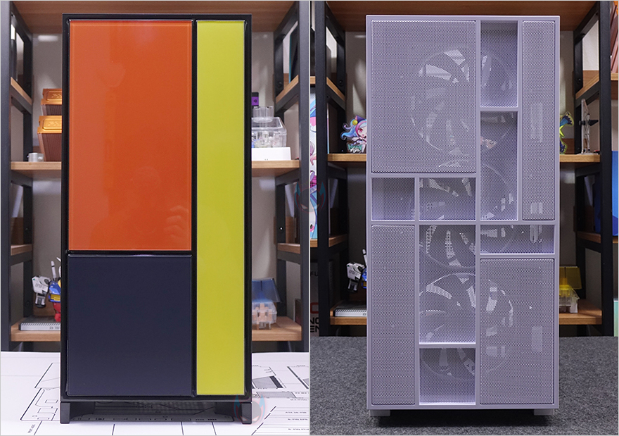 그럼, 본격적으로 마이크로닉스 위즈맥스 ML-360 WIDE BTF PC케이스의 외형부터 살펴보면, 색상은 ML-360 WIDE VIEW BTF 모델과 마찬가지로 화이트와 블랙 2가지 색상으로 출시되었으며, 한눈에 봐도 가장 큰 차이점은 시작에서 언급했던 전면 메쉬 디자인입니다. 특히, 메쉬 디자인부분은 앞서 주요 특징에 표기했듯이 먼저 출시했던 EH1 몬드리안 디자인과도 유사하죠. EH1 몬드리안이 화가 디자인의 영감을 받은 느낌이라면, ML-360 WIDE BTF는 좀 더 모던하면서도 실용성을 챙긴 디자인 느낌입니다. 또한, 전면 베젤을 분리하면 안쪽 내부에는 140mm 팬이 최대 3개 기본 장착되어 전면 쿨링시스템을 갖추고 있으며, 베젤에 장착된 메쉬망들은 나사 고정으로 풀면 분리가 가능하기 때문에 일부 소비자는 튜닝을 생각해 볼 수도 있겠습니다. 참고로, 팬은 RGB가 없는 Non-RGB로 일부 소비자는 아쉬울 수 있겠지만, 전면 메쉬 스퀘어 디자인을 고려하면 개인적으로 Non-RGB가 더 잘 어울린다 생각됩니다. 또한, 수랭 쿨러 장착 시 전면에 기본 팬 대신에 라디에이터도 장착이 가능한데 최대 420mm까지 장착할 수 있습니다.