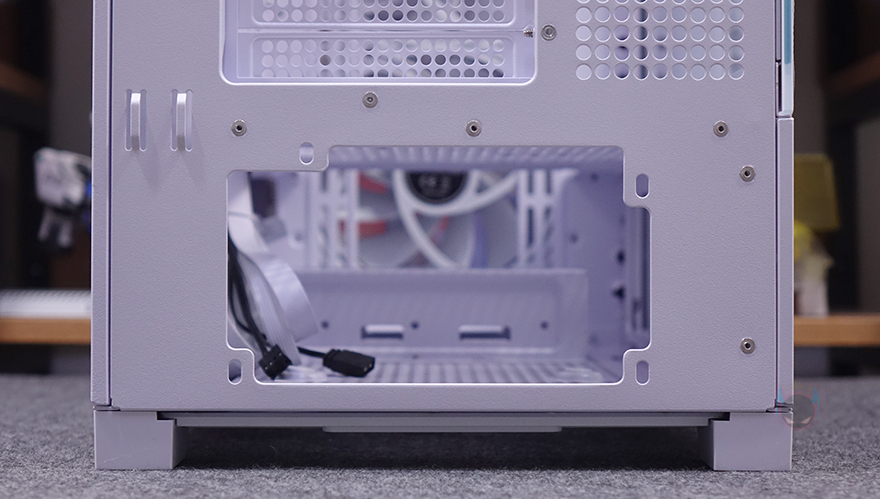 케이스 후면 역시 ML-360 WIDE VIEW BTF와 동일한 디자인으로 맨 아래 파워서플라이 자리를 제외하면 대부분 배기효과를 위해 에어홀 처리를 해놨으며, 내부 후면에는 배기 팬으로 140mm 팬이 기본 장착된 걸 미리 확인할 수 있습니다. 물론, 120mm 팬도 교체할 수 있게 나사홀이 적용되어 있고, 내부 상단 여유공간 높이 만큼에도 에어홀 처리를 해놨습니다. 팬 아래 PCI 슬롯 자리는 미들타워 기준 7개를 구성하고 있으며, 왼쪽에 외부 연결 케이블을 정리할 수 있게 케이블/벨크로타이 걸이도 적용되어 있죠. 맨 아래는 파워서플라이 자리고 그 아래 받침대 높이의 틈사이로 손을 넣으면 후방향에서 하단 먼지 필터를 슬라이딩 방식으로 손쉽게 분리할 수 있습니다. 외형 끝으로 케이스 밑바닥 부분에는 방금 확인한 분리형 먼지 필터를 분리했을 시 하단 쿨링효과를 위해 후면과 마찬가지로 에어홀 디자인이 적용된 걸 확인할 수 있으며, 내부에서 확인하겠지만, 내부 앞자리에는 HDD 베이 배치로 좌우 위치이동을 할 수 있게 지원하고 있죠. 케이스 받침대는 미끄럼방지 및 진동소음 최소화를 위해 패드가 기본 부착되어 있으며, 높이는 약 21mm입니다.