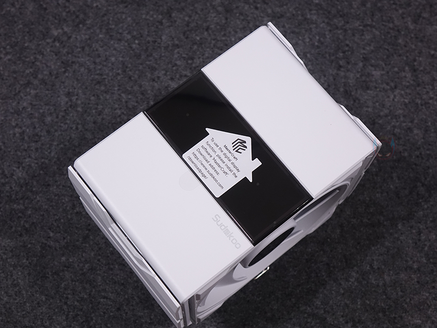 쿨러 상단에는 일반적으로 노출되는 방열핀과 히트파이프가 보이지 않고 커스텀 디자인의 커버가 적용되었는데, 가운데 블랙색상 부분은 바로 디스플레이(Display) 부분으로 개봉 시 전용 소프트웨어 '마스터크래프트(MasterCraft)' 다운로드 안내 스티커가 부착되어 있습니다. 물론, 사용 전에는 제거해야 하고, 화면 크기는 앞서 제품 박스 표기에서 확인했듯 70.7x27.8mm입니다. 쿨러 측면 역시 방열핀을 대부분 가린 커버 디자인이 적용되었는데, 한쪽에 모델명을 새겨놨고, 우측 커버 부분에는 디스플레이 작동으로 메인보드 USB 내부헤더와 연결되는 케이블이 적용된 것을 확인할 수 있죠. 그리고, 유일하게 방열핀이 가려지지 않은 곳은 후면부분으로 후면 방열핀도 나름 공기흐름과 디자인을 고려해 입체감 있게 적용했습니다.