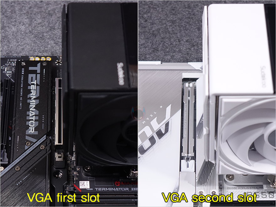 쿨러 장착이 끝난 후, 램(RAM) 슬롯에 램을 장착해 보면 4개 풀-뱅크 모두 장착해도 쿨러 앞부분이 슬롯 영역을 침범하지 않는 것을 확인할 수 있습니다. 즉, 간섭 발생이 없는 거죠. 다만, SK700V 쿨러 같은 경우 앞에서도 확인했듯이 커스텀 디자인의 커버 디자인이 적용되어서 일반적으로 방열핀이 노출된 쿨러보다 폭(Width)이 146mm로 좀 넓은 편입니다. 그래서, 이런 쿨러들은 메인보드의 그래픽카드가 장착되는 PCIe 슬롯이 첫 번째 슬롯(first slot)에 위치하고 있으면 간섭이 발생해서 그래픽카드 장착이 불가능합니다. 그래서, 꼭 메인보드 선택 시 그래픽카드 장착 슬롯이 두 번째 슬롯(Second slot)에 위치한 메인보드를 사용해야 합니다.