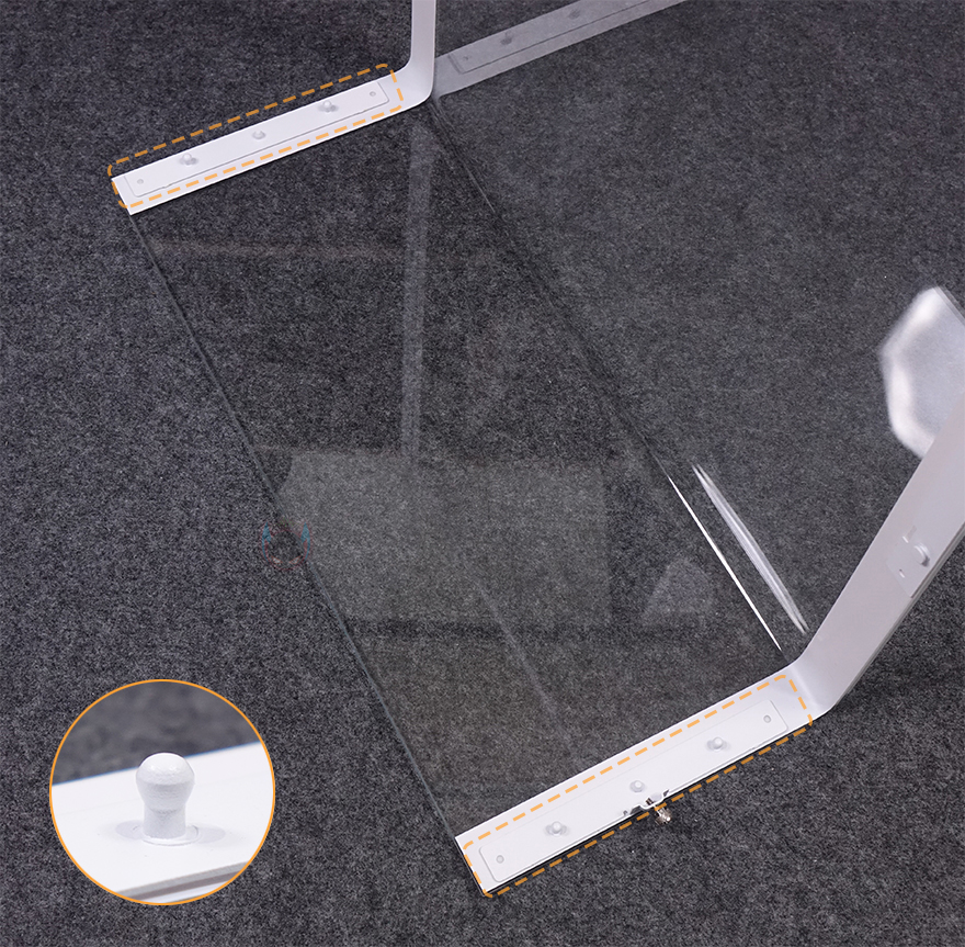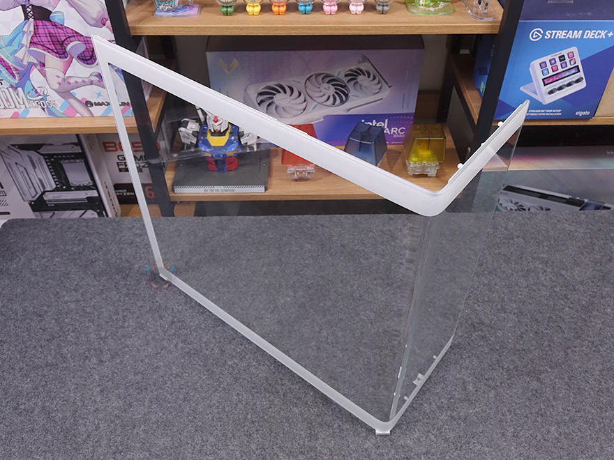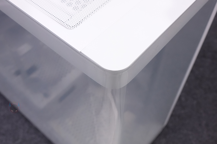 전면에서 측면까지 일체형으로 적용된 커브드 강화유리는 앞서 분리 방법 가이드에서 확인했듯이 전면 강화유리 위치 중앙 아래 밑바닥 부분에 적용된 손나사를 풀고, 앞으로 밀면 분리가 되는데, 가이드 안내처럼 분리할 때는 케이스를 눕히는 게 좀 더 분리하는데 수월하고 안전합니다. 강화유리를 분리하면 통짜형 즉 일체형 커브드 형태를 확인할 수 있고, 안쪽에 전면과 측면으로 파손방지를 위한 프레임이 적용된 걸 확인할 수 있죠. 또한 추가로 전면에는 볼-헤드핀 방식으로 고정되고, 측면은 걸쇠방식으로 고정되는 걸 확인할 수 있습니다. 그리고, 전면 오른쪽에 남는 여백의 자리 역시 통일감을 주기 위해 곡선형 디자인으로 처리했죠. 또한, 반대쪽 측면인 전면시 기준 우측 패널은 새시 패널로 후면 손나사로 고정했으며, 내부 측면 쿨링시스템 위치에 맞춰 에어홀 디자인을 적용했습니다. 구멍이 촘촘하기 때문에 별도의 먼지 필터는 적용되지 않았습니다.