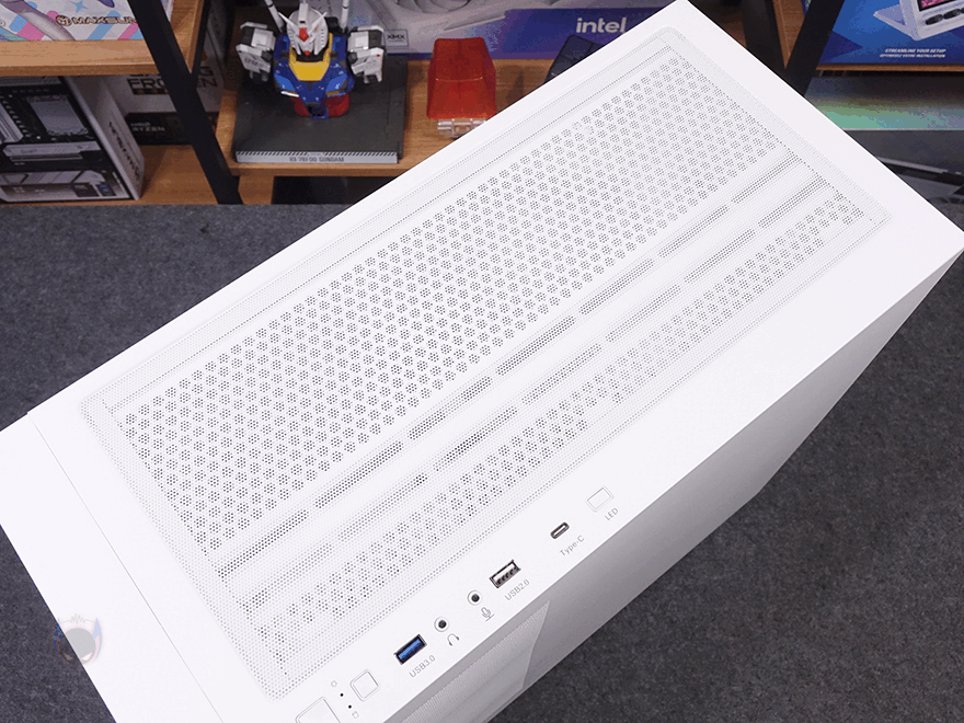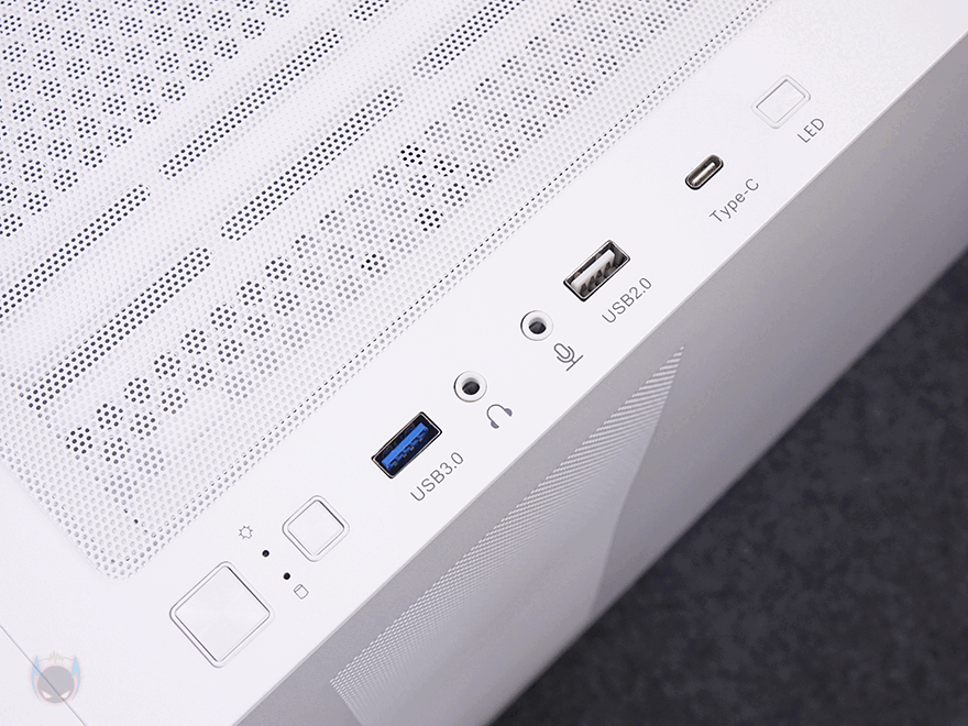 케이스 상단에는 자석방식의 분리형 먼지 필터가 부착되어 있으며, 필터를 분리하면 벌집 모양 에어홀 처리와 함께 내부 쿨링 시스템을 갖출 수 있게 나사홀이 처리되어 있는데, 팬 장착 시 140mm는 최대 2개, 120mm는 최대 3개를 장착할 수 있고, 수랭쿨러 사용 시 최대 360mm 라디에이터를 장착 지원합니다. 그리고, 맨 오른쪽 여백 라인 앞자리에는 버튼 및 포트들이 배치되어 있는데, 맨 앞에서부터 전원 버튼, 리셋 버튼, USB 3.0 포트, 오디오 포트, 마이크 포트, USB 2.0 포트, USB 타입 C포트, LED 버튼순으로 적용되어 있죠. 참고로, USB 타입 C포트 전송속도는 10 Gbps입니다. 그리고, 각 포트들은 앞서 구성품에서 확인한 마개들로 포트 미사용 시 먼지유입을 방지할 수 있습니다.