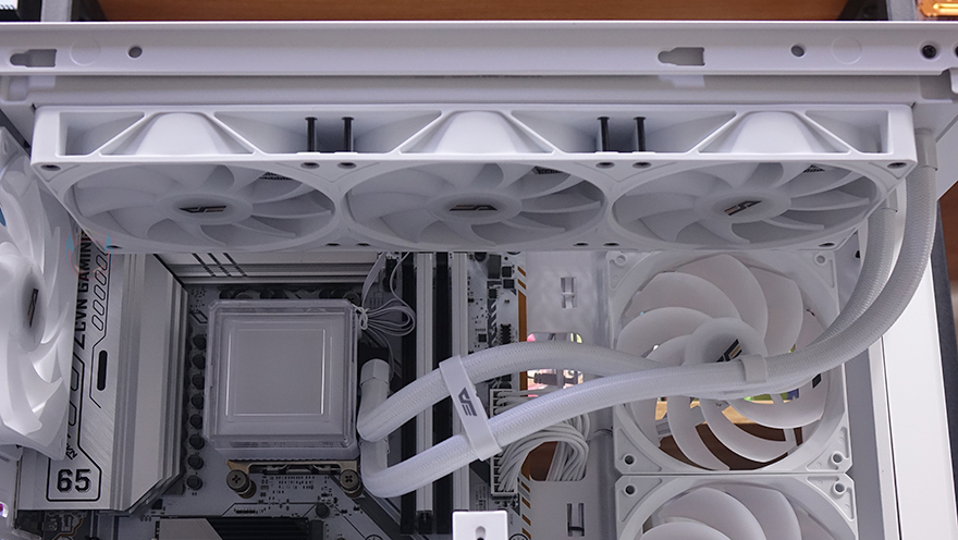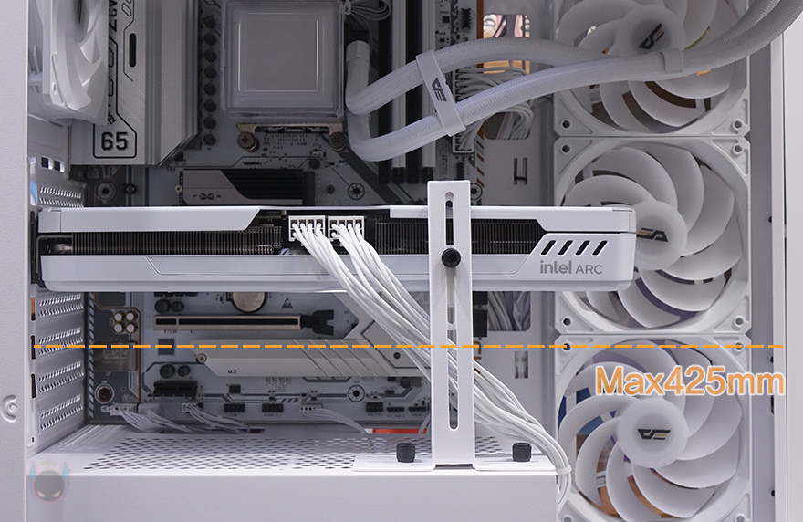 다크플래쉬 DS900G PC케이스를 사용해 시스템 조립을 해봤습니다. 먼저, CPU 쿨러 같은 경우에는 수랭 쿨러 시 측면에 기본 쿨링시스템을 갖추고 있기 때문에 상단 장착이 기본 자리가 되겠고, 최대 360mm 라디에이터까지 장착이 가능합니다. 다만, 전형적인 미들타워 구조이기 때문에 메인보드 윗부분과 공간이 겹치는 구간이라서 메인보드를 먼저 장착하는게 조립에 수월합니다. 참고로, 공랭 쿨러시 타워형 기준으로 높이는 최대 170mm까지 지원합니다. 그리고, 그래픽카드는 최대 425mm 길이까지 지원해 사실상 시중에 판매되는 그래픽카드는 모두 장착이 가능하고, 그래픽카드 지지대가 기본 제공되기때문에 무거운 그래픽카드가 아래로 처지는걸 방지할 수 있습니다. 이 밖에 메인보드 후면에는 선정리 공간과 함께 하단부 파워서플라이를 장착하는데, 앞서 언급했듯이 전형적인 미들타워 구조이기때문에 선정리 공간은 파워서플라이 깊이 길이가 짧을수록 좋고, 케이블이 유연할수록 수월합니다. 개인적으로 자사에서 출시한 140mm 깊이에 풀-모듈러 파워서플라이 퍼펙스모스트 모델을 추천합니다.
