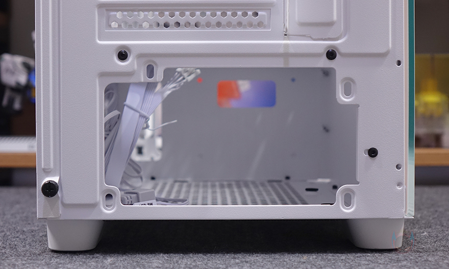 메인보드 트레이 후면에는 CPU-컷-아웃 바로 아래에 2.5인치 SSD/HDD를 장착할 수 있게 브래킷이 장착되어 있는데, 나사를 풀면 분리가 되고, 브래킷 안쪽에 SSD/HDD를 장착할 수 있습니다. 그리고, 브래킷은 기본 장착된 오른쪽 위치 말고, 왼쪽 위치로도 이동해서 장착할 수 있죠. 내부 끝으로 하단 뒷부분 자리는 파워서플라이 자리로 받침과 진동 소음 최소화를 위해 패드를 부착해 놨으며, 뒤에 조립에서도 언급하겠지만, 전형적인 미들타워 구조이기 때문에 사실상 파워서플라이 자리 앞부분이 선정리 공간이라 파워서플라이 깊이가 짧을수록 공간 확보에 유리합니다.