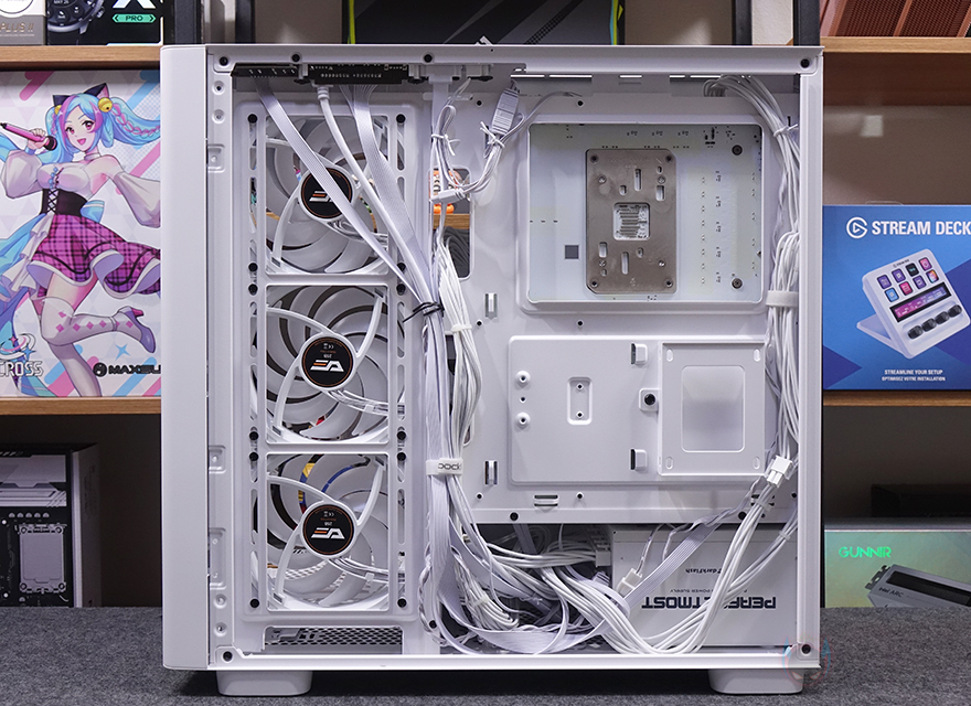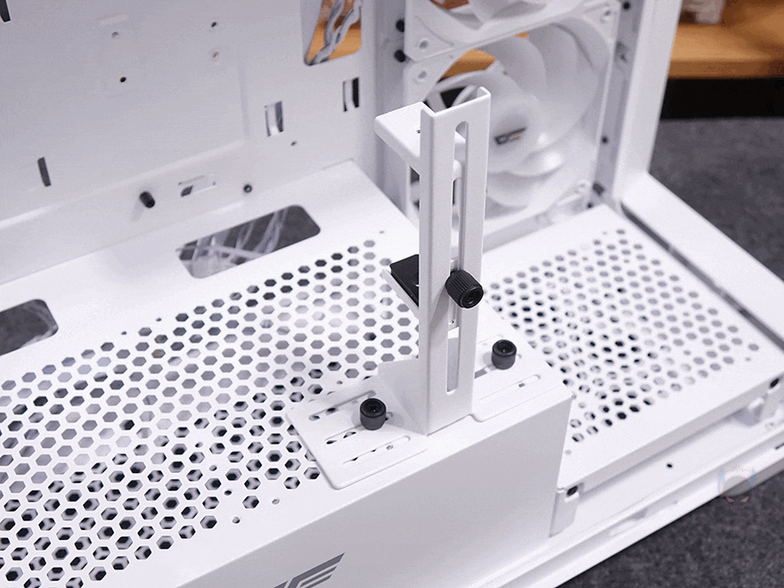 이제, 다크플래쉬 DS900G PC케이스의 내부를 살펴보는데, 내부 구조는 사실상 먼저 나왔던 DS900과 동일합니다. 일단, 그래픽카드 지지대가 기본 장착되어서 제공되는데, 모두 손나사로 고정되어서 나사를 풀면 높낮이 조절부터 지지대 좌우, 앞뒤 위치조절까지 할 수 있습니다. 물론, 손나사를 풀면 분리도 가능하죠. 그리고, 메인보드가 장착되는 트레이 부분에는 CPU-컷-아웃을 비롯해 주변으로 케이블 정리를 위한 선정리-홀이 처리되어 있으며, 맨 오른쪽에는 측면 쿨링시스템으로 120mm 팬이 기본 장착되어 있는데, DS900 모델에도 사용되었던 C7A 모델 팬의 리버스 팬이 3개 장착되어 있습니다. 물론, 기본 팬 대신에 사용자가 수랭쿨러 시 라디에이터 장착도 할 수 있는데, 최대 240mm까지 지원하죠.