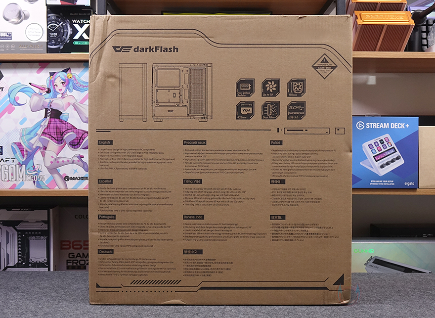 제품박스부터 살펴보면, 전면에는 모델명과 함께 제품 풀-샷 이미지를 담고 있습니다. 이미 작년에 출시한 DS900 모델을 알고 있다면, 이미지만 봐도 강화유리가 바뀌었다라는 걸 쉽게 짐작할 수 있죠. 그리고, 후면에는 제품의 전면과 측면 추가 이미지와 함께 주요 특징으로 수랭쿨러 라디에이터 지원, 최대 팬 개수, CPU 쿨러 높이, 그래픽카드 최대 길이, 먼지 필터, USB 3.0 포트를 언급해 놨으며, 한국어를 포함한 다국적 언어로도 표기해 놨습니다. 물론, 박스 한쪽 측면에 상세하게 제품의 기본 사양을 표기해 놨기 때문에 오프라인 매장에서 구입할 때도 충분히 정보를 얻는데 도움이 되겠습니다.