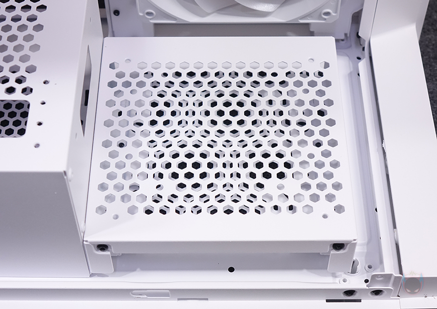 케이스 후면에는 윗부분에 배기 역할로 내부 120mm 팬이 기본 장착된걸 미리 확인할 수 있는데, 요즘은 보기 드문 팬 그릴을 함께 장착했으며, 아래 PCI 슬롯은 미들타워 기준인 7개를 적용했고, 맨 아래는 파워서플라이 자리입니다. 외형 끝으로, 케이스 밑바닥 부분을 확인해보면 모서리 부근으로 타원형 디자인의 받침대가 적용되어 있고, 케이스 상단처럼 밑바닥부분 역시 자석방식의 분리형 먼지 필터가 부착되어 있으며, 필터를 분리하면 하단 역시 쿨링효과를 볼 수 있게 벌집 모양의 에어홀 디자인을 적용했습니다. 그리고, 뒤에 내부에서 확인하겠지만, 내부 앞자리에는 HDD 베이 위치로 고정 나사가 적용되어 있는데, 풀면 분리가 됩니다.